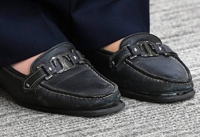 사진을 보면 정 청장의 구두는 밑창이 윗부분과 떨어져 고무창이 벌려있으며, 신발 앞 부분도 닳아져 있다.
