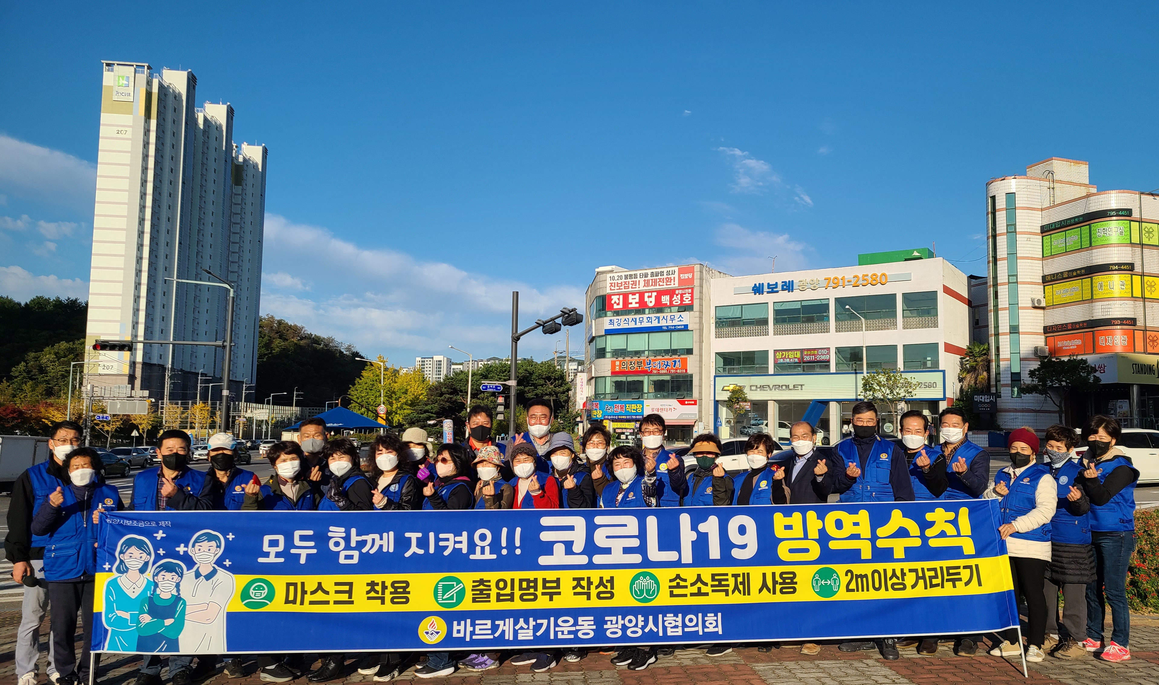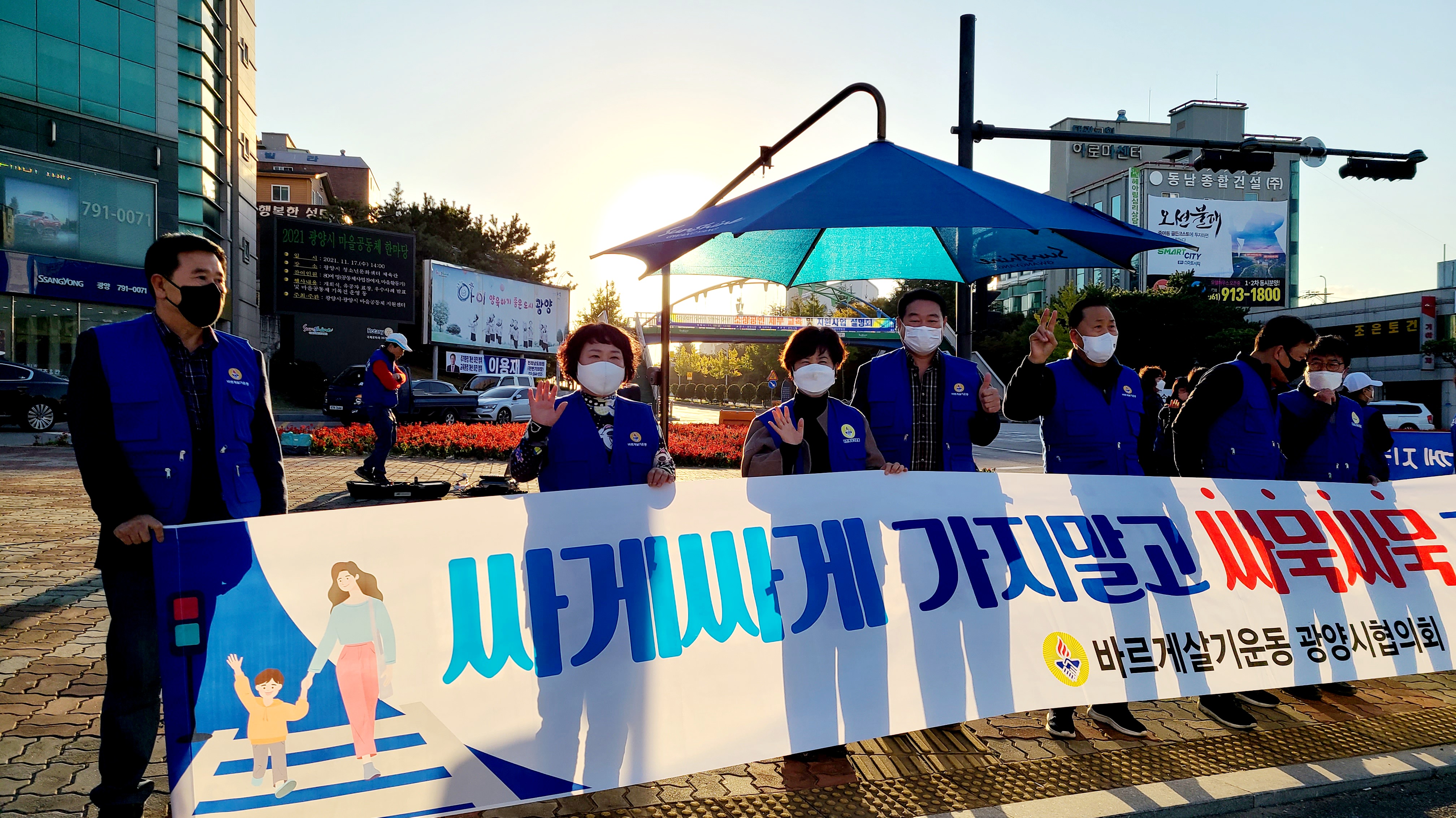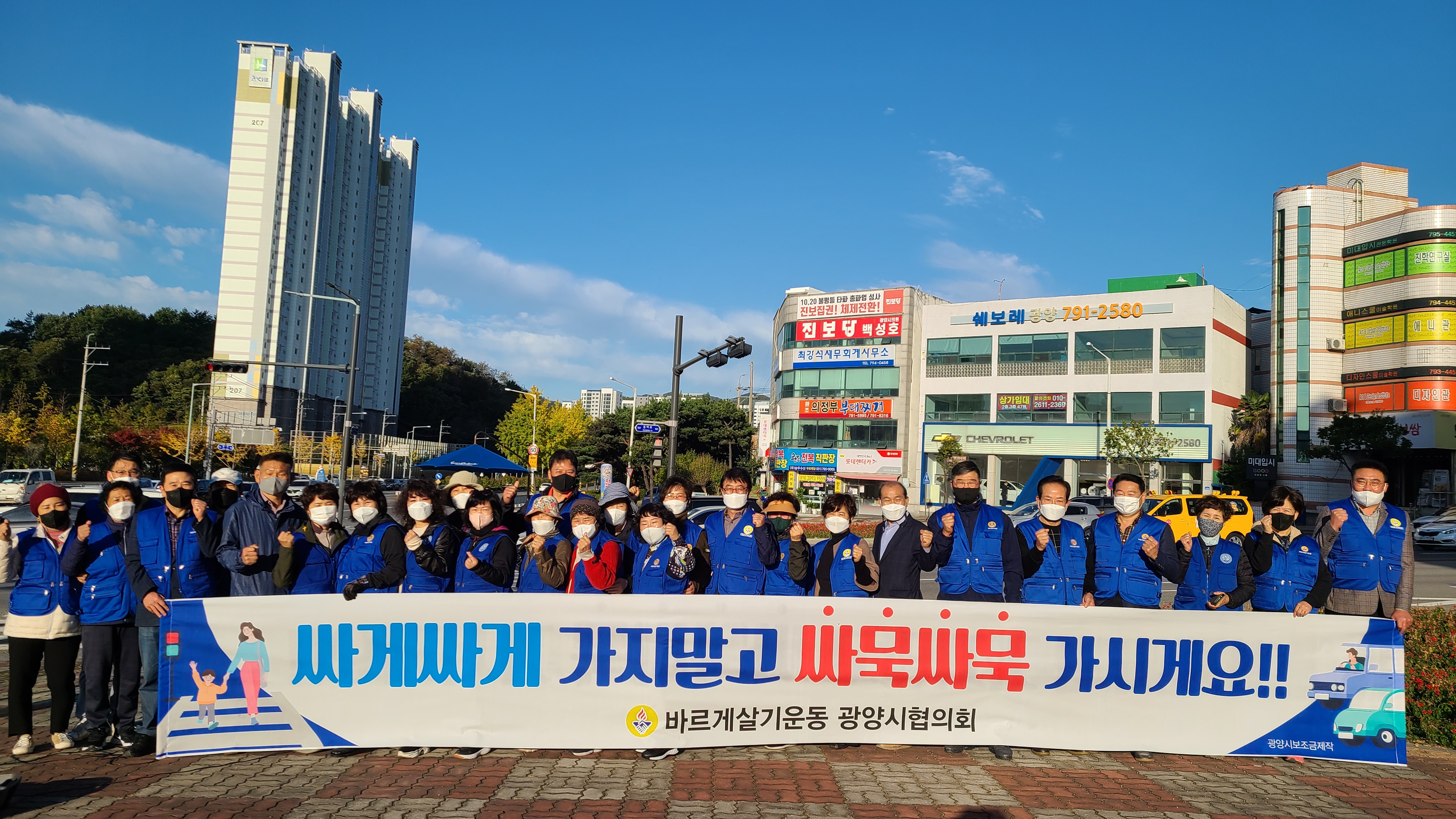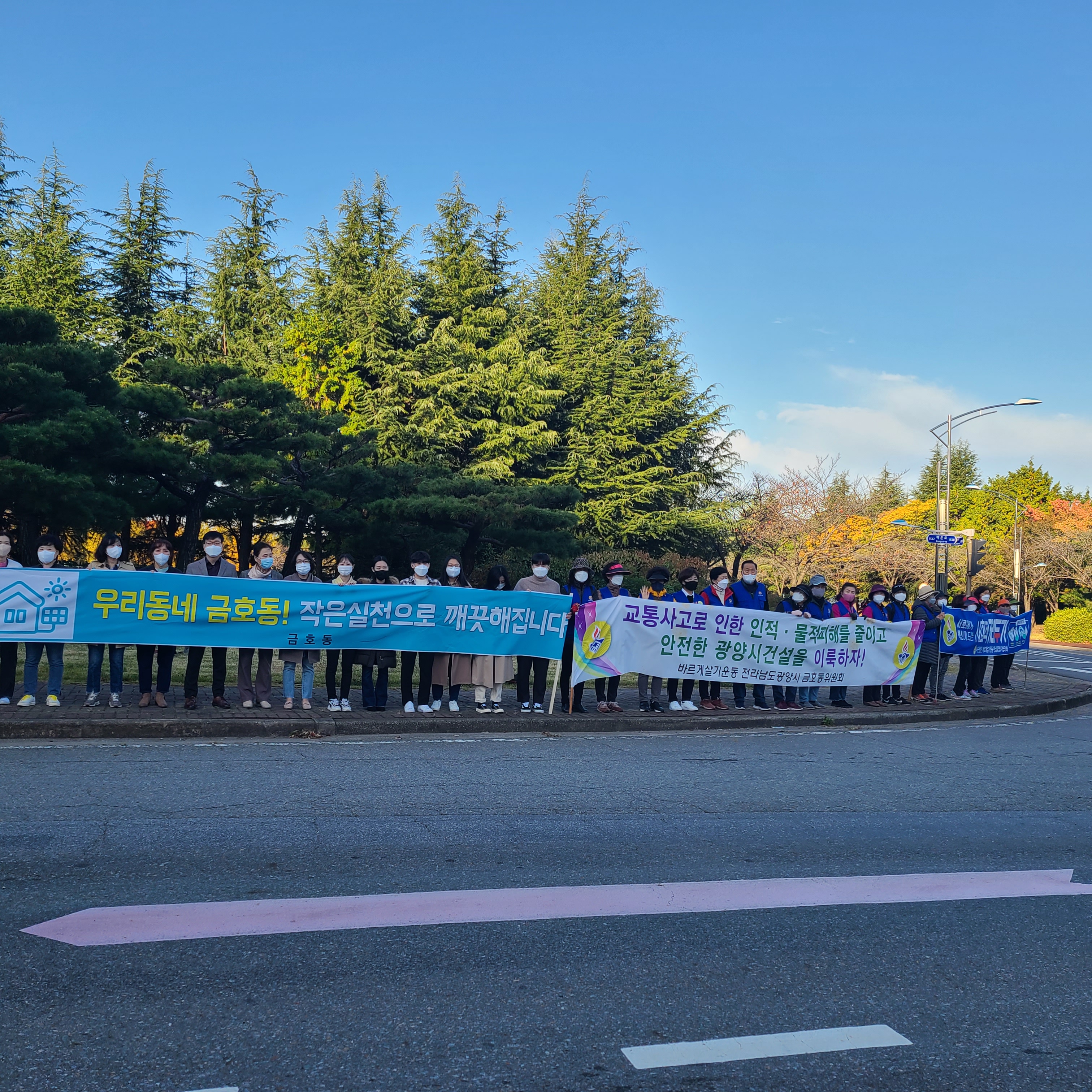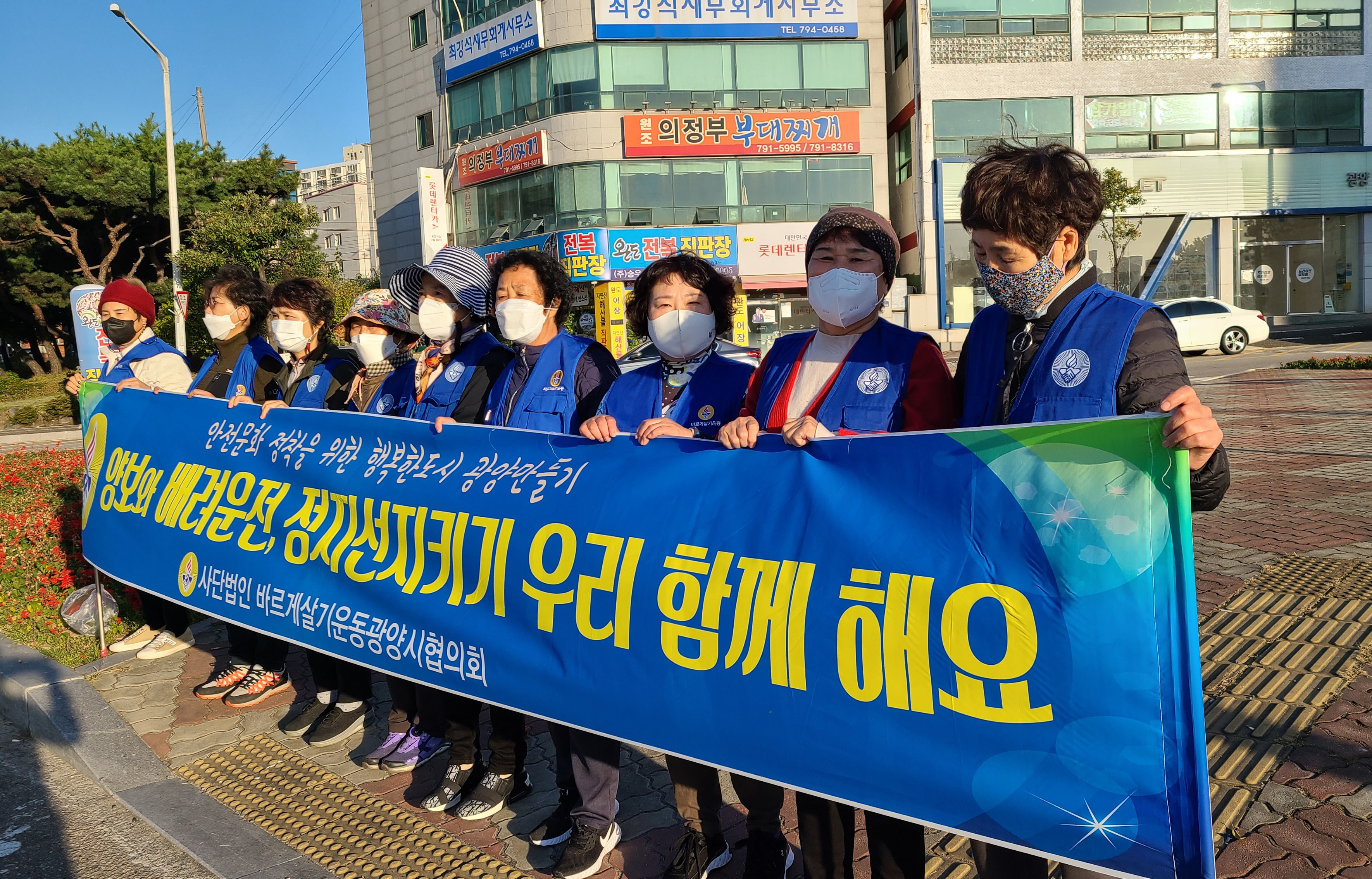 어제(10월 29일) 금요일 아침 바르게살기운동 광양시협의회(회장 김영조,여성회장 김순호)는 중마동 컨테이너부두사거리에서 중마동, 진상면 위원회 회원들과 캠페인을, 금호동 백운아트홀 사거리에서 광영동. 금호동 위원회 회원들과 함께 캠페인을 전개하였다.