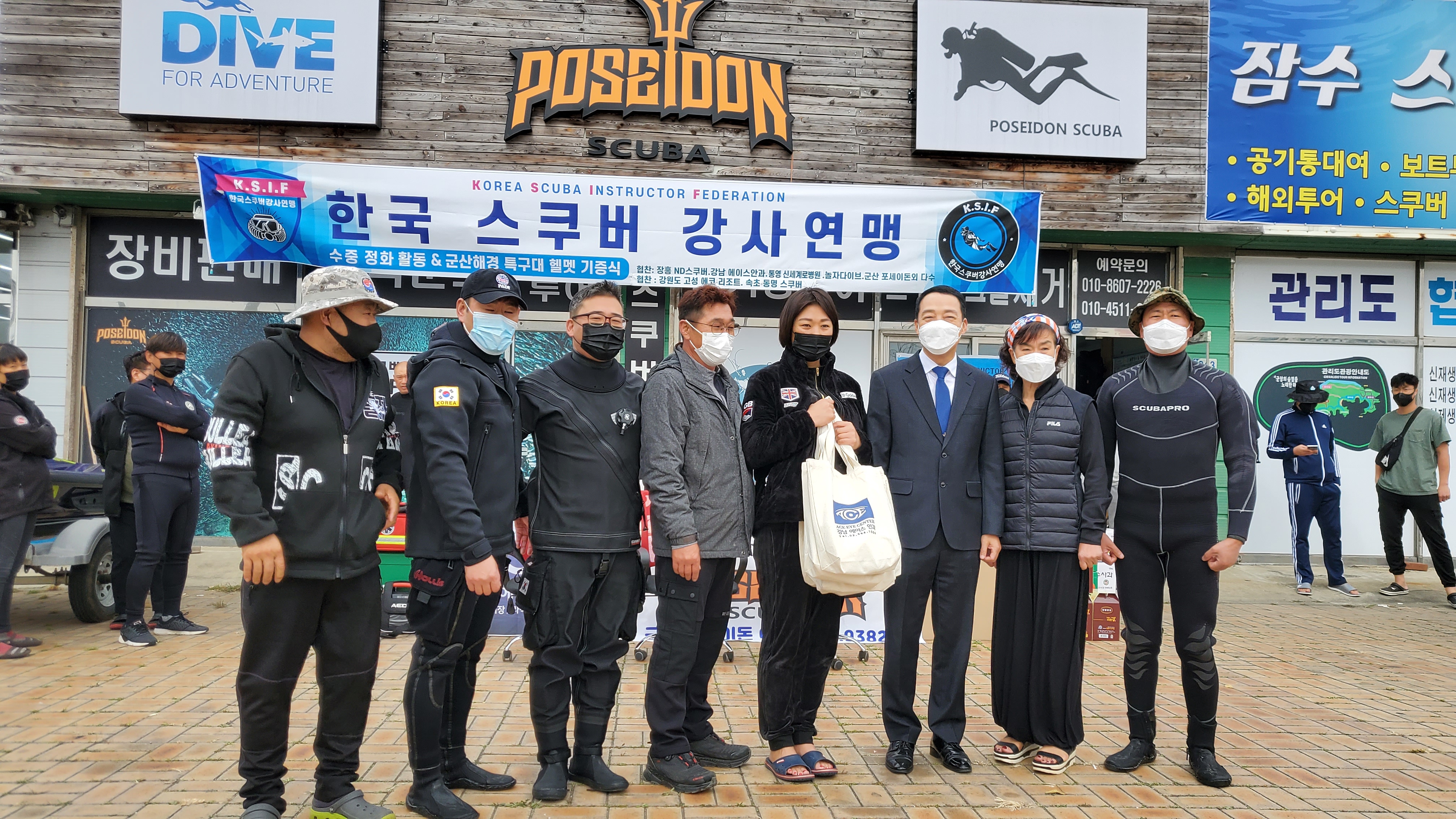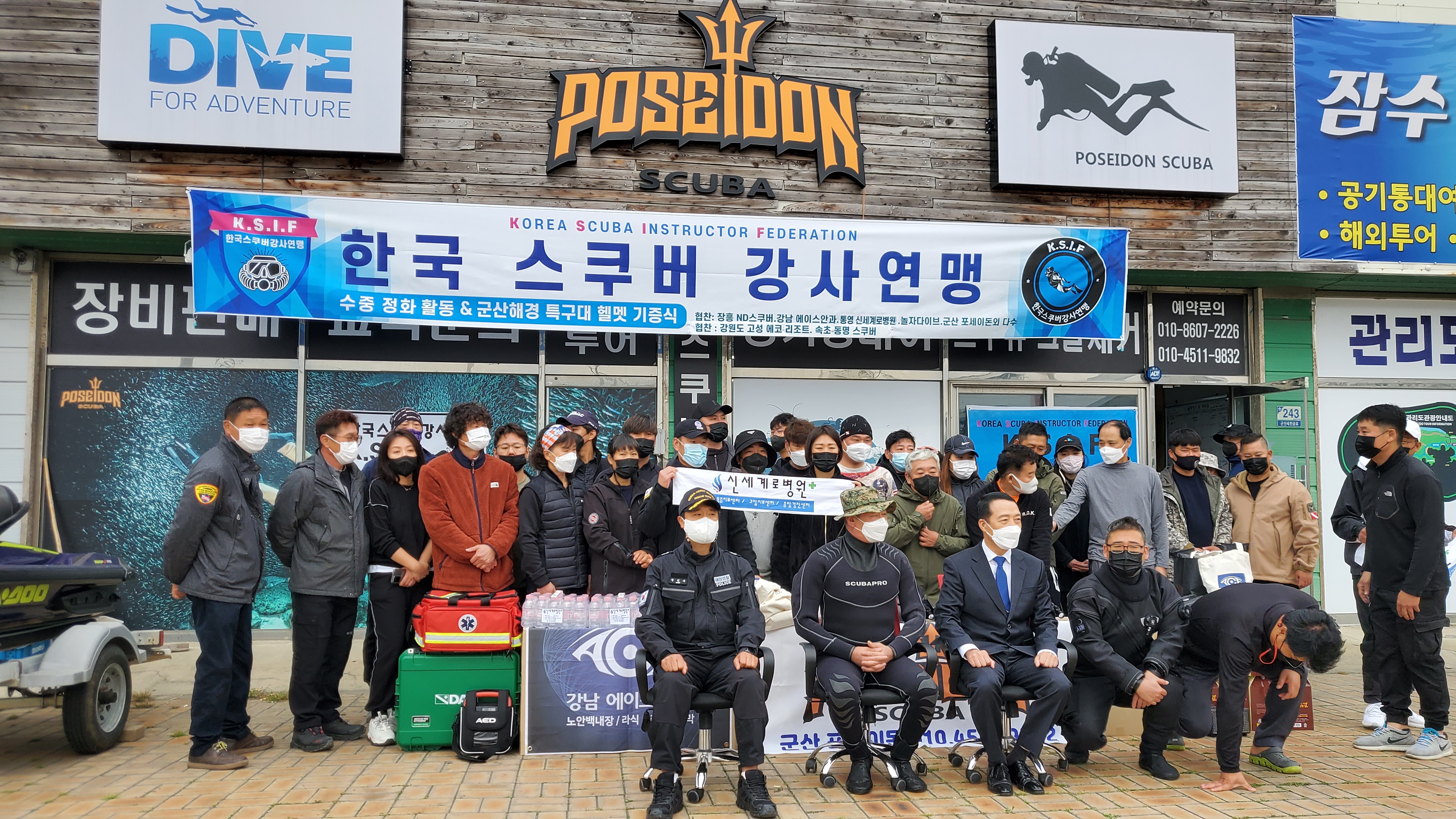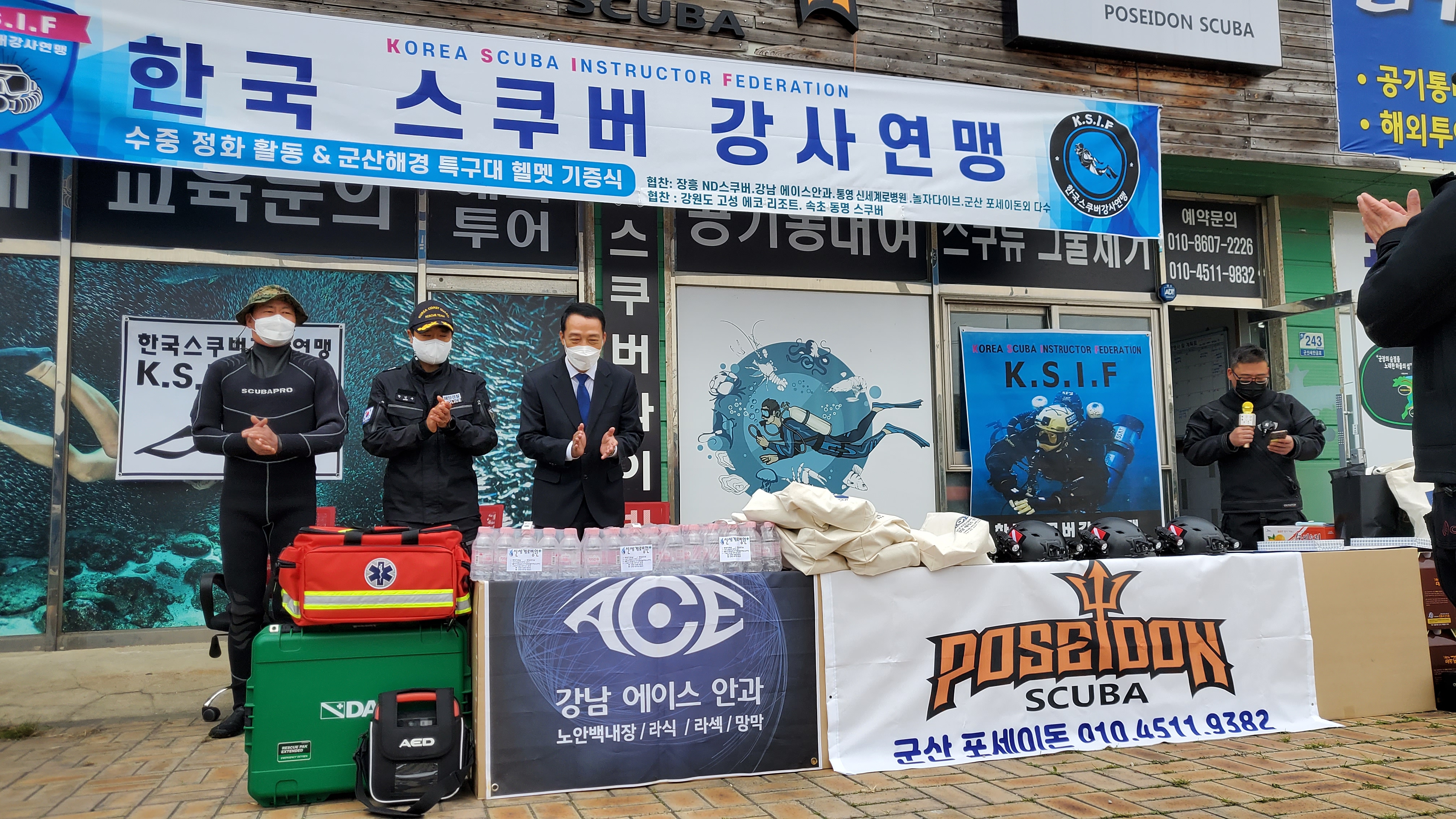 K.S.I.F(한국스쿠버강사연맹) 장흥 김성필수석부회장이 군산해경특수대로 부터 기증품을 전달을 받고 있다. ...