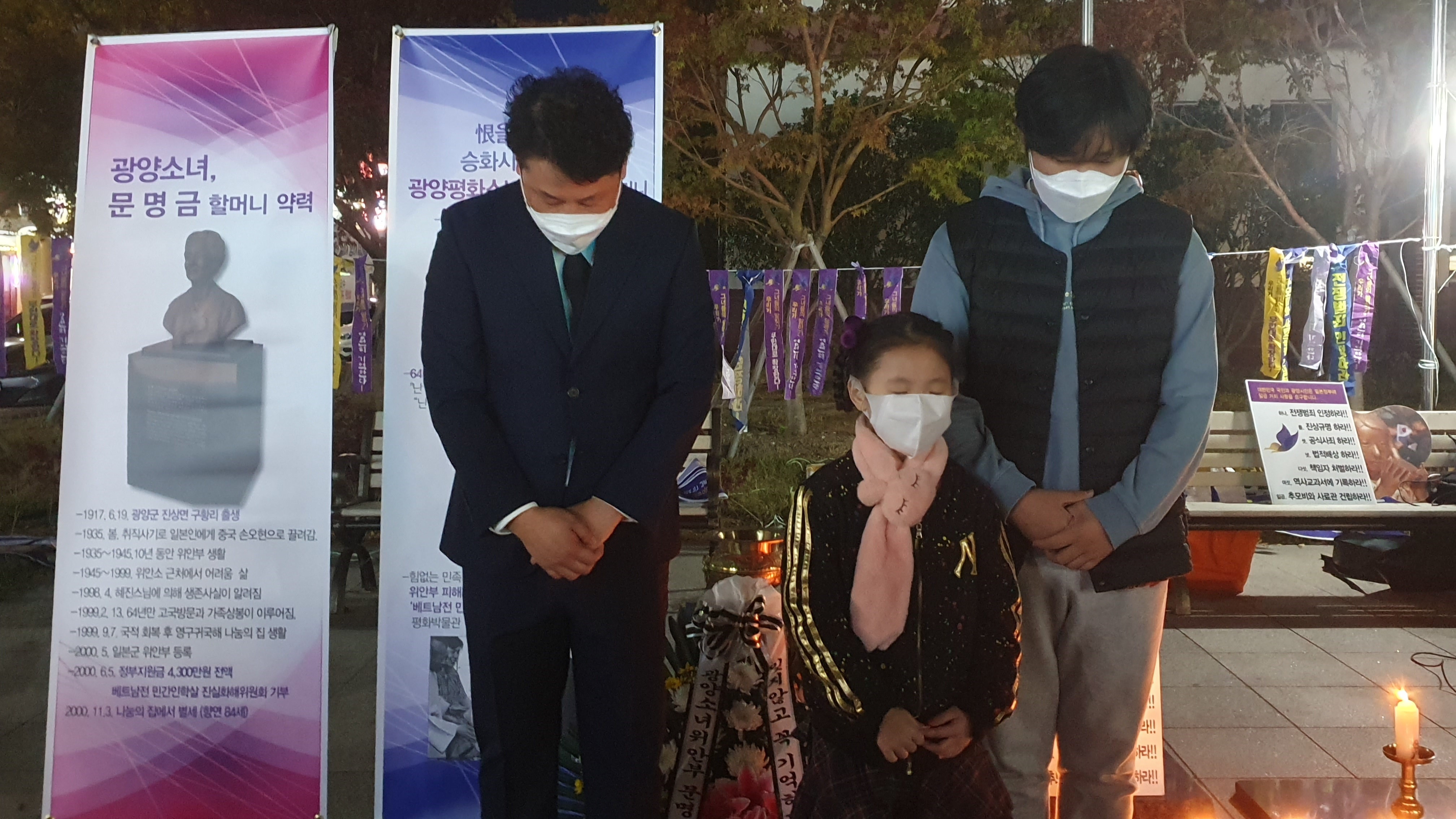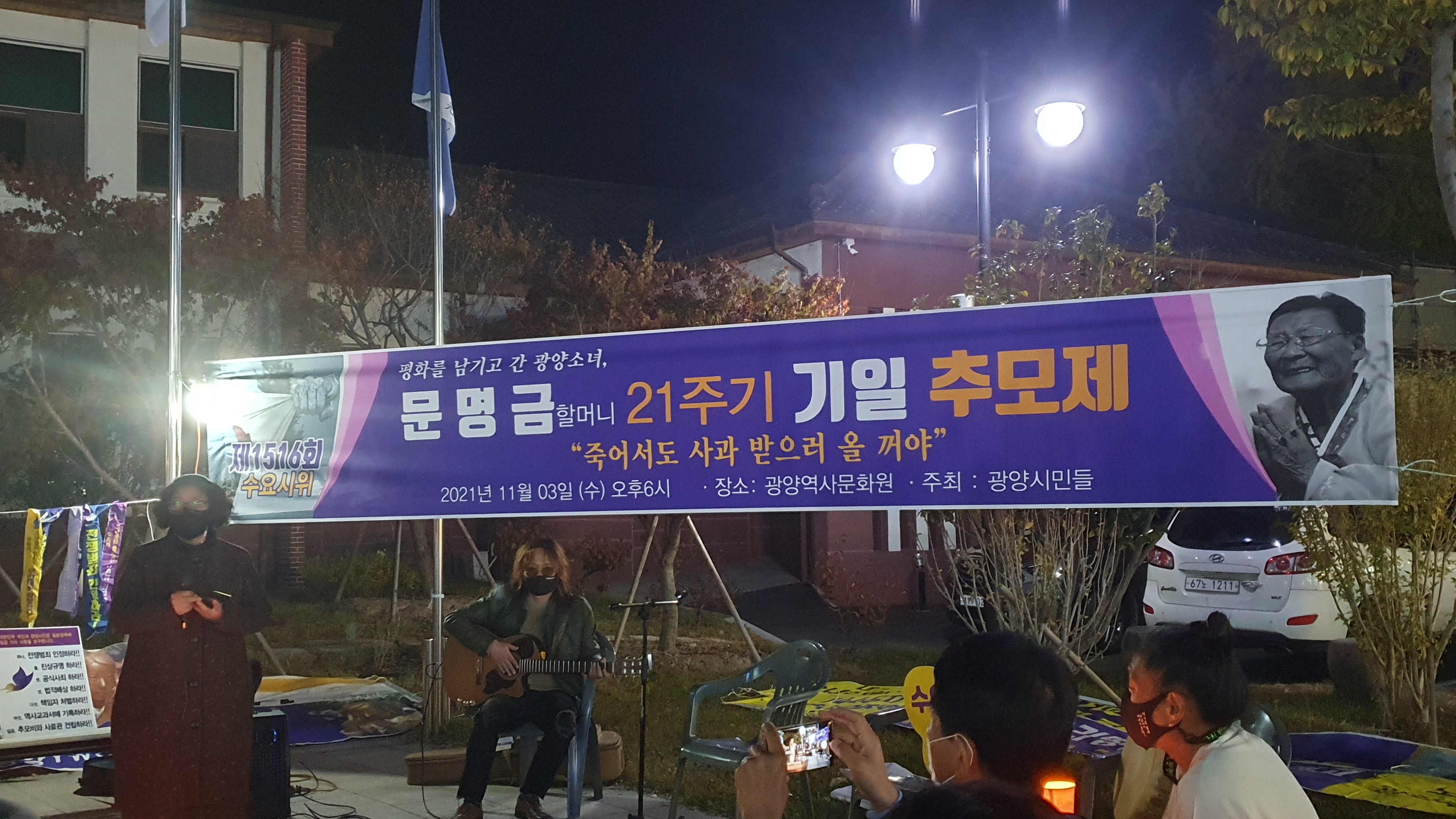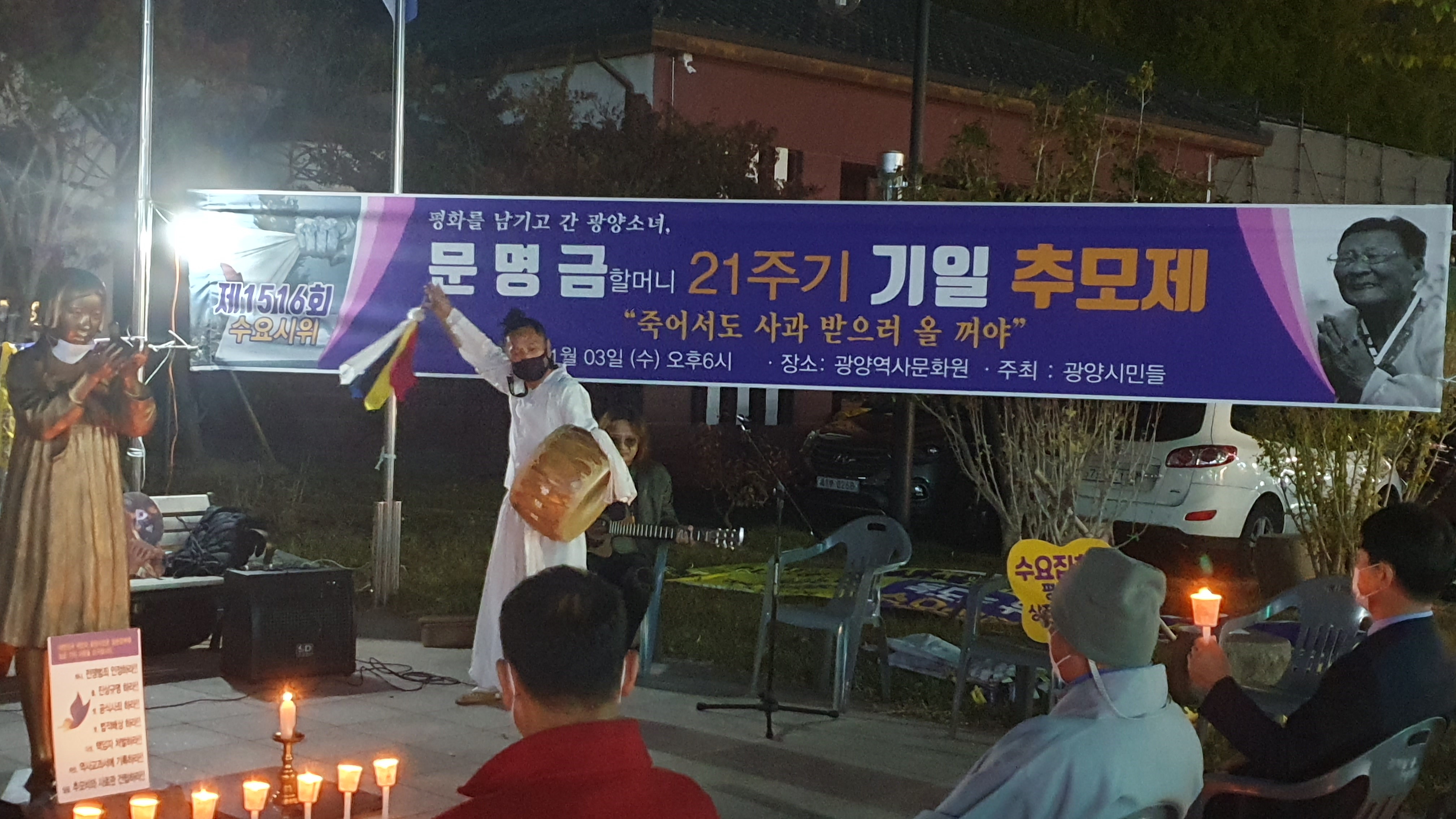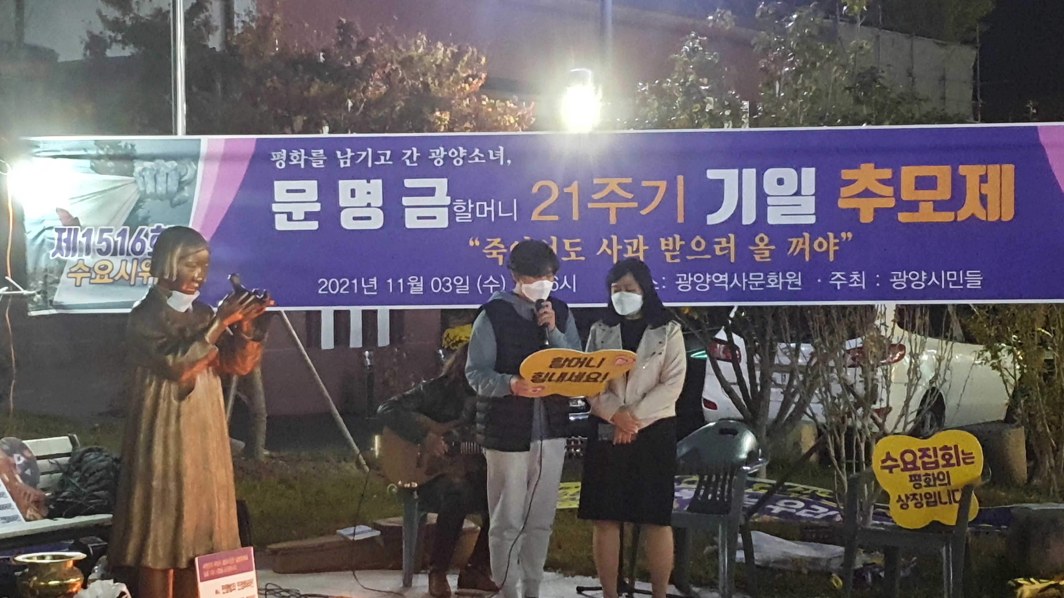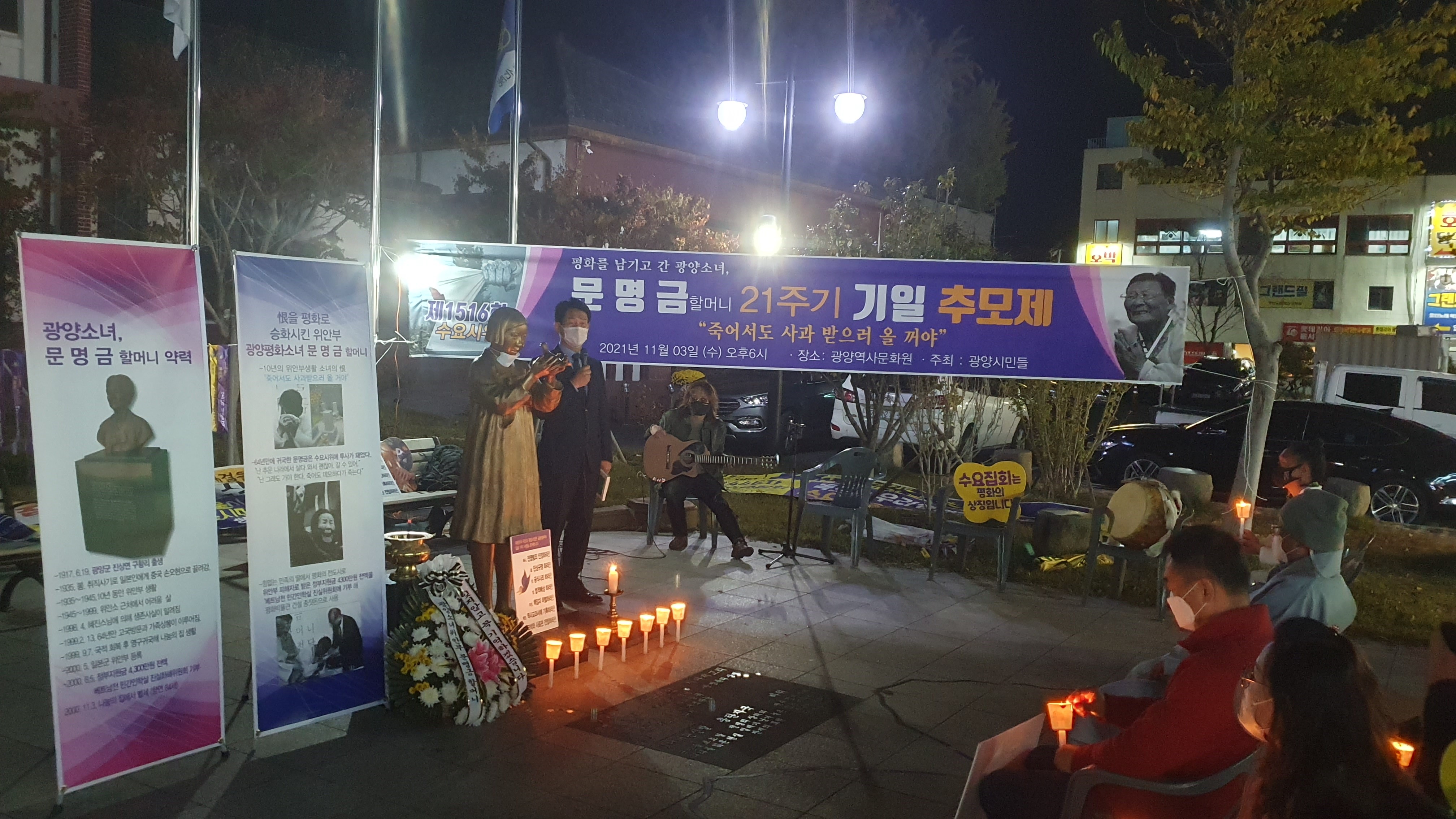 [#해륙뉴스1]서정민본부장=광양시 시민들이 광양역사문화원 앞에 모여 (2021년11월3일 수요일 18시)문명금 할머니 제21주기 기일 추모제를 진행하였다.