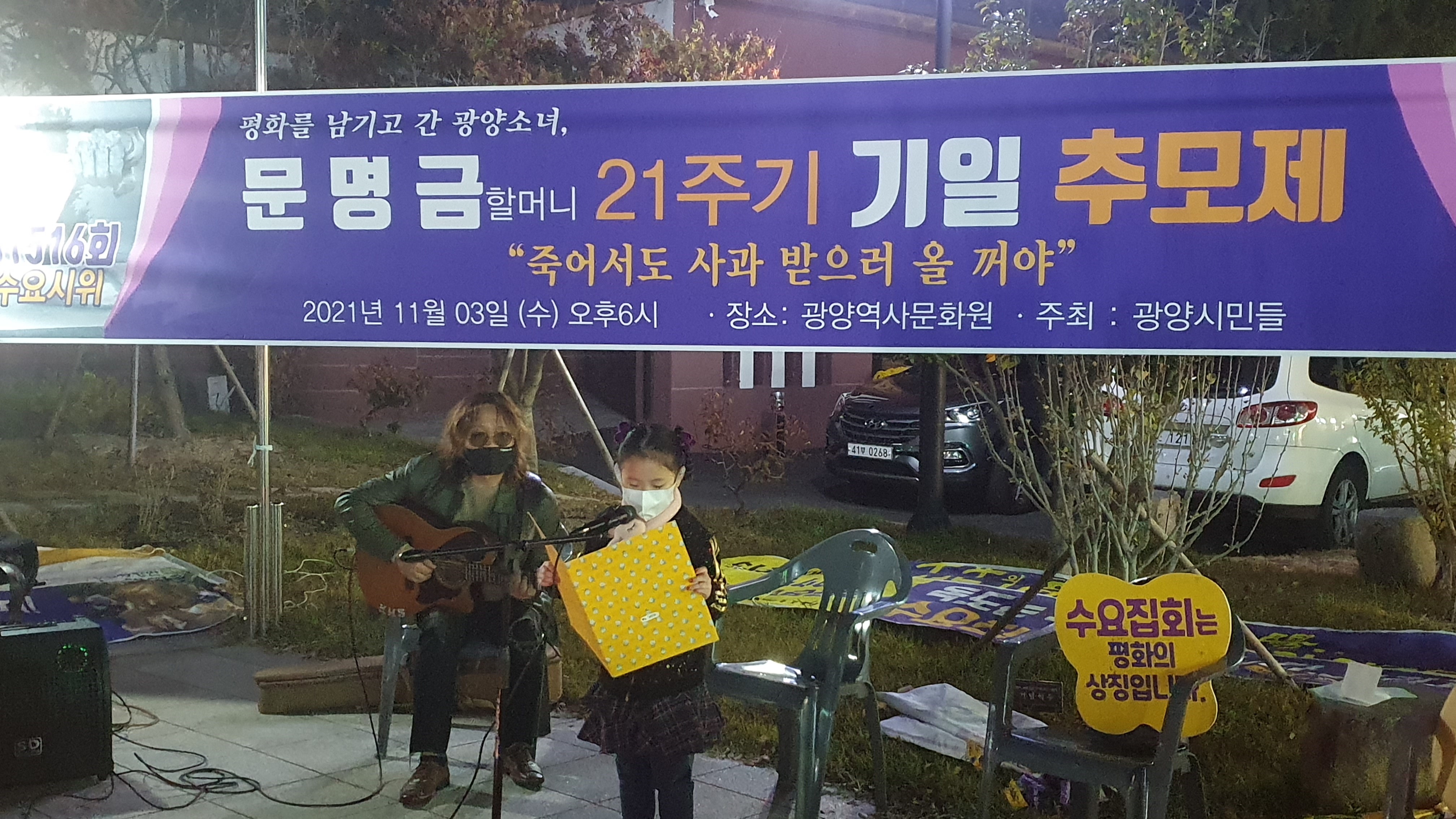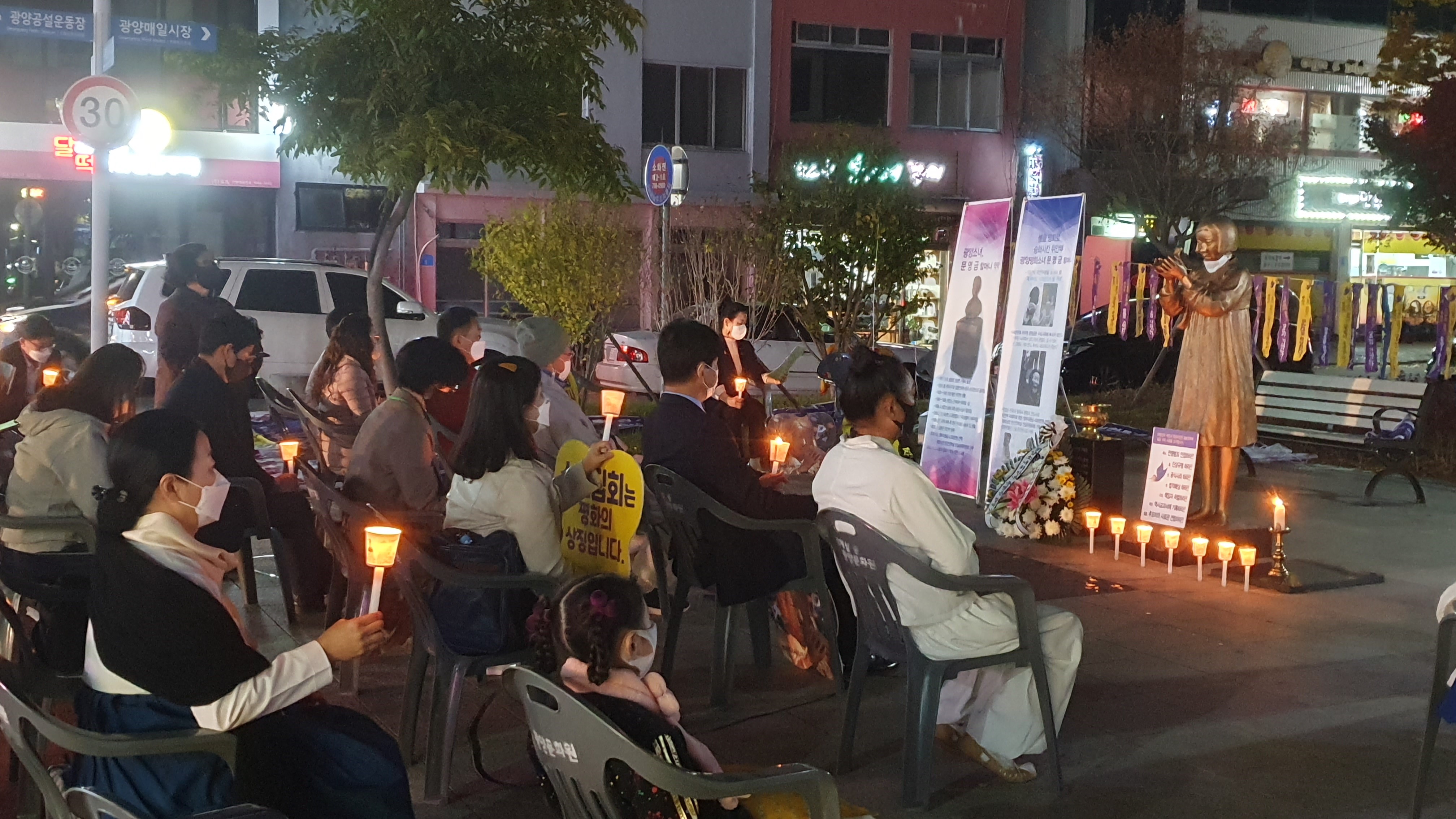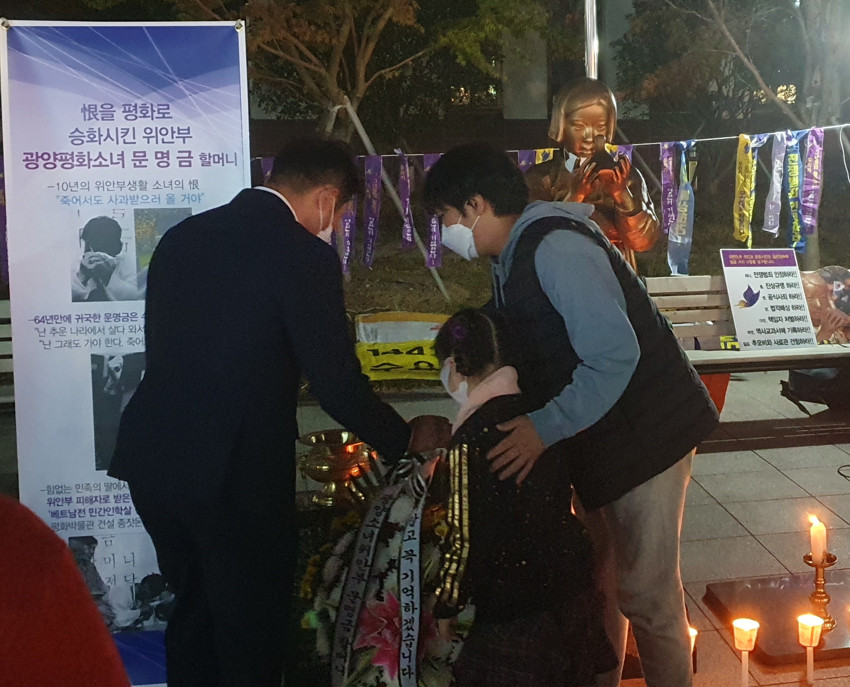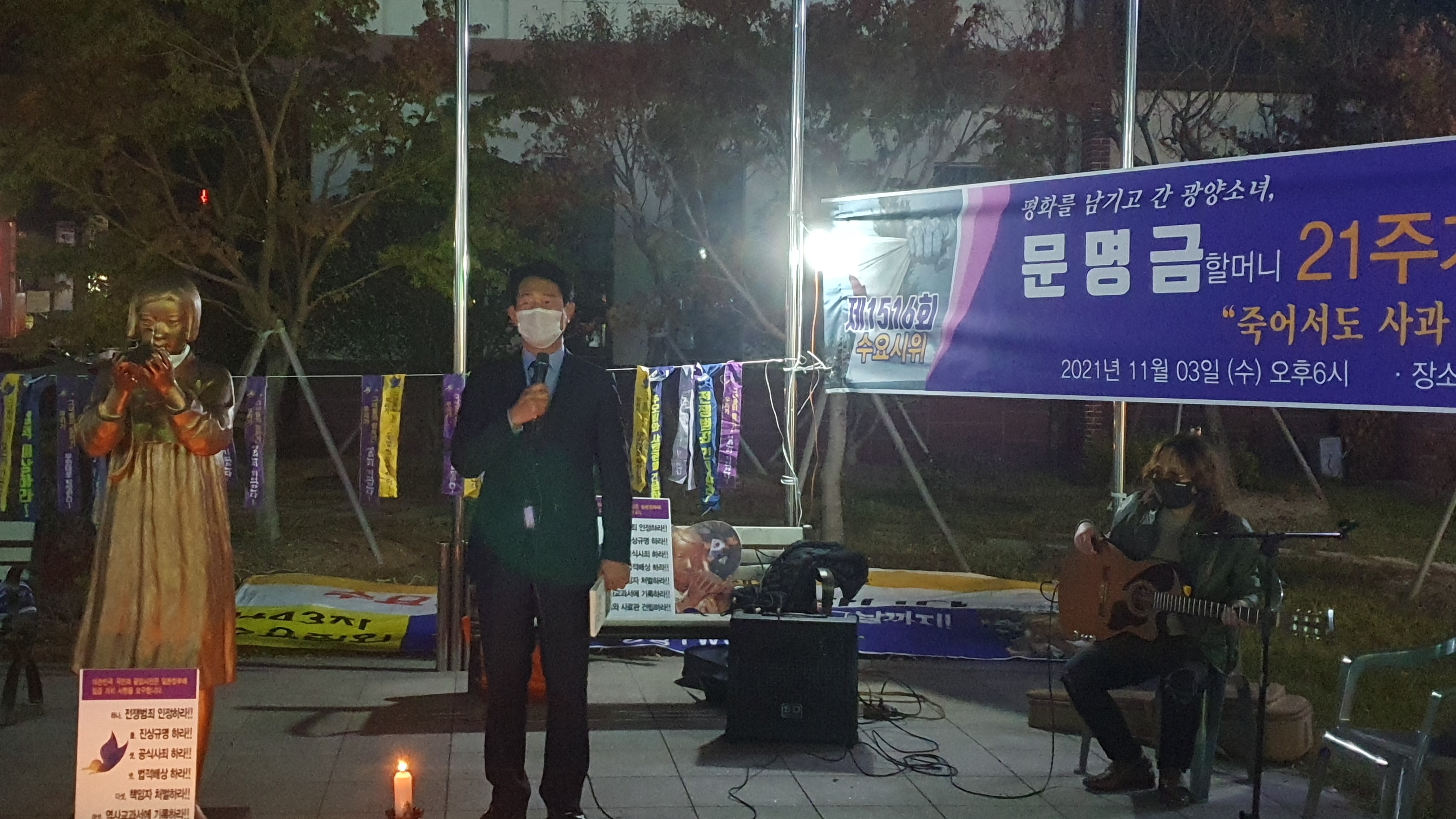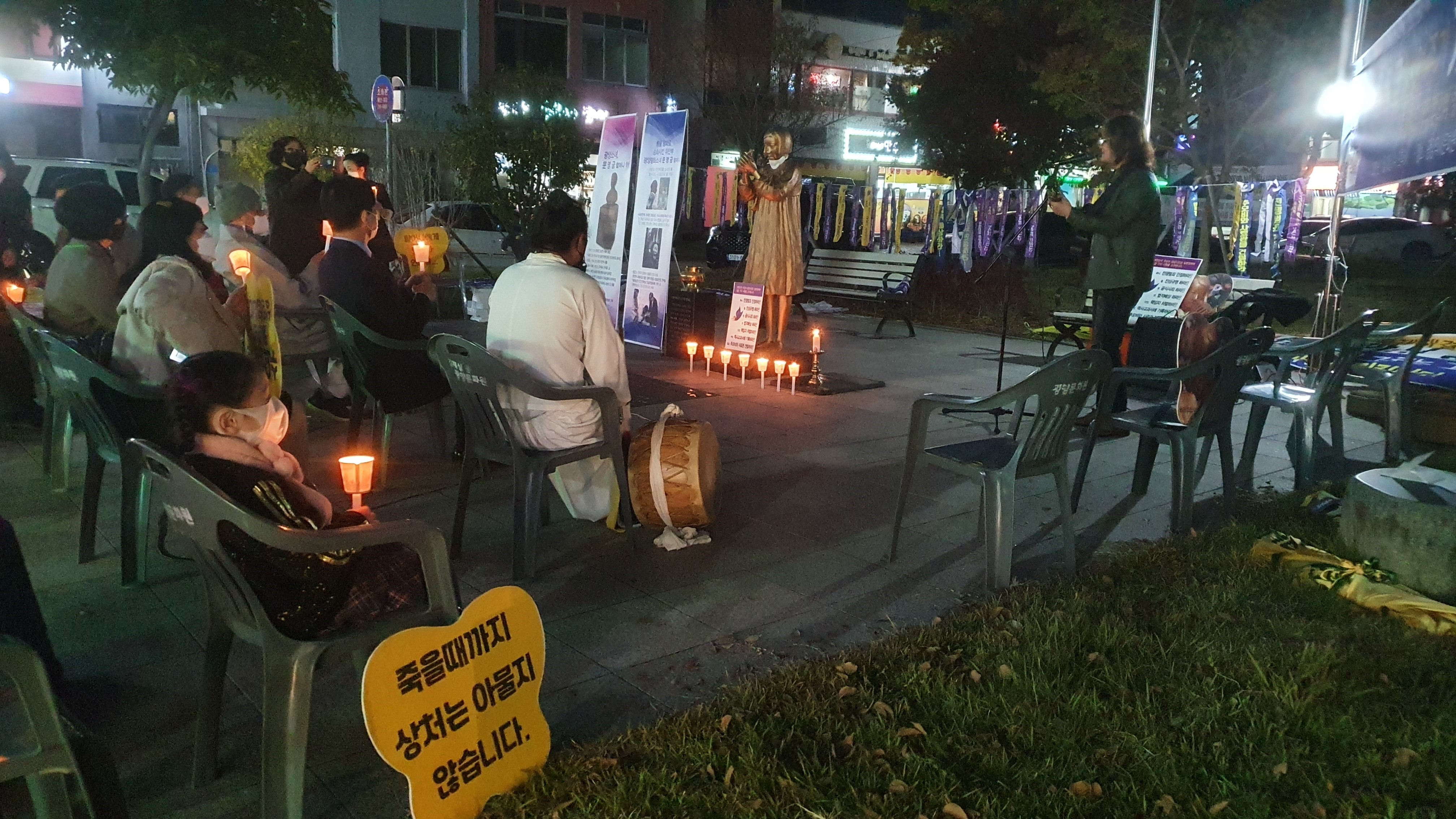 [#해륙뉴스1]서정민본부장=광양시 시민들이 광양역사문화원 앞에 모여 (2021년11월3일 수요일 18시)문명금 할머니 제21주기 기일 추모제를 진행하였다.