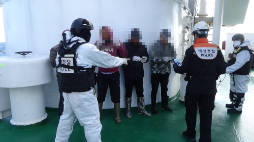 제주해경으로 부터 나포된 선박의 선원에 대하여 신원을 확인하고 있다. / 제주해양경찰서 제공 불법으로 포획된...