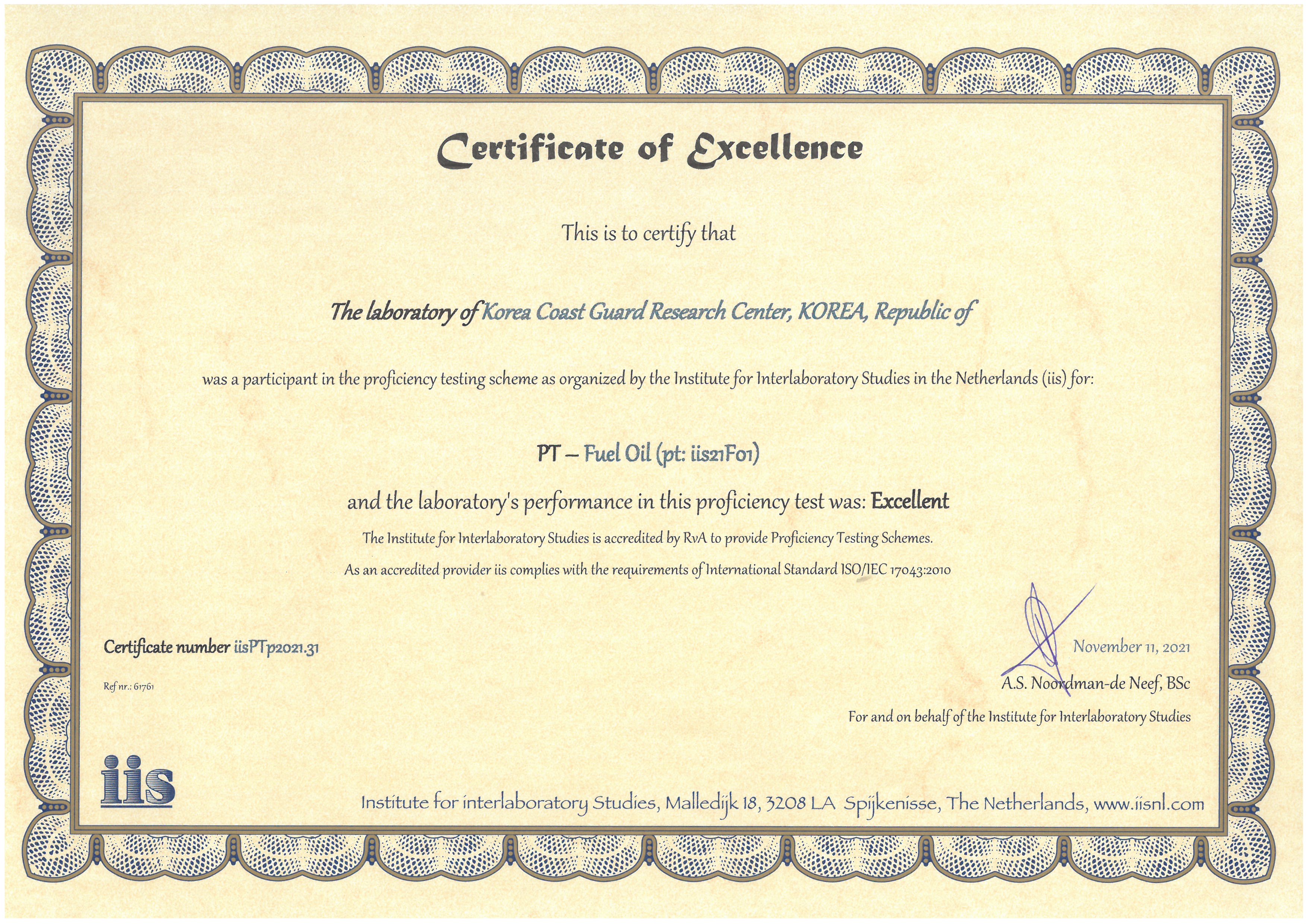 관인 충남 천안 해양경찰연구센터에서 ‵2021년도 유류분석 국제숙련도′프로그램에 참가해 연료유(Fuel Oil) 분석 분야 2년 연속 최우수 등급(Excellent) 판정을 받았다고 25일 밝혔다.