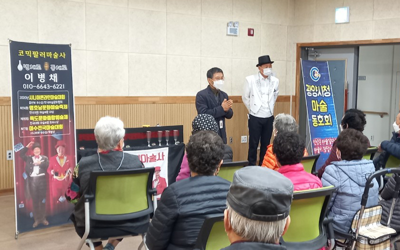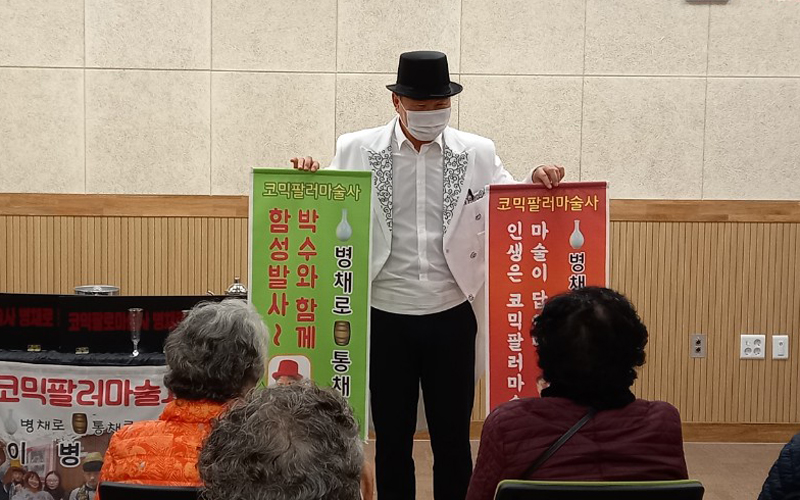 「코로나19」로 함께하지 못했던 어르신들이 오랜만에 마술공연으로 즐거운 시간을 보냈다. 큰 키에 멋진 검정모자의 마술사 병채로통채로 이병채가 지갑 속에서 불을 꺼내고, 천 원짜리 지폐가 만원으로 변하는 속임수 손재주에 큰 박수를 보냈다.