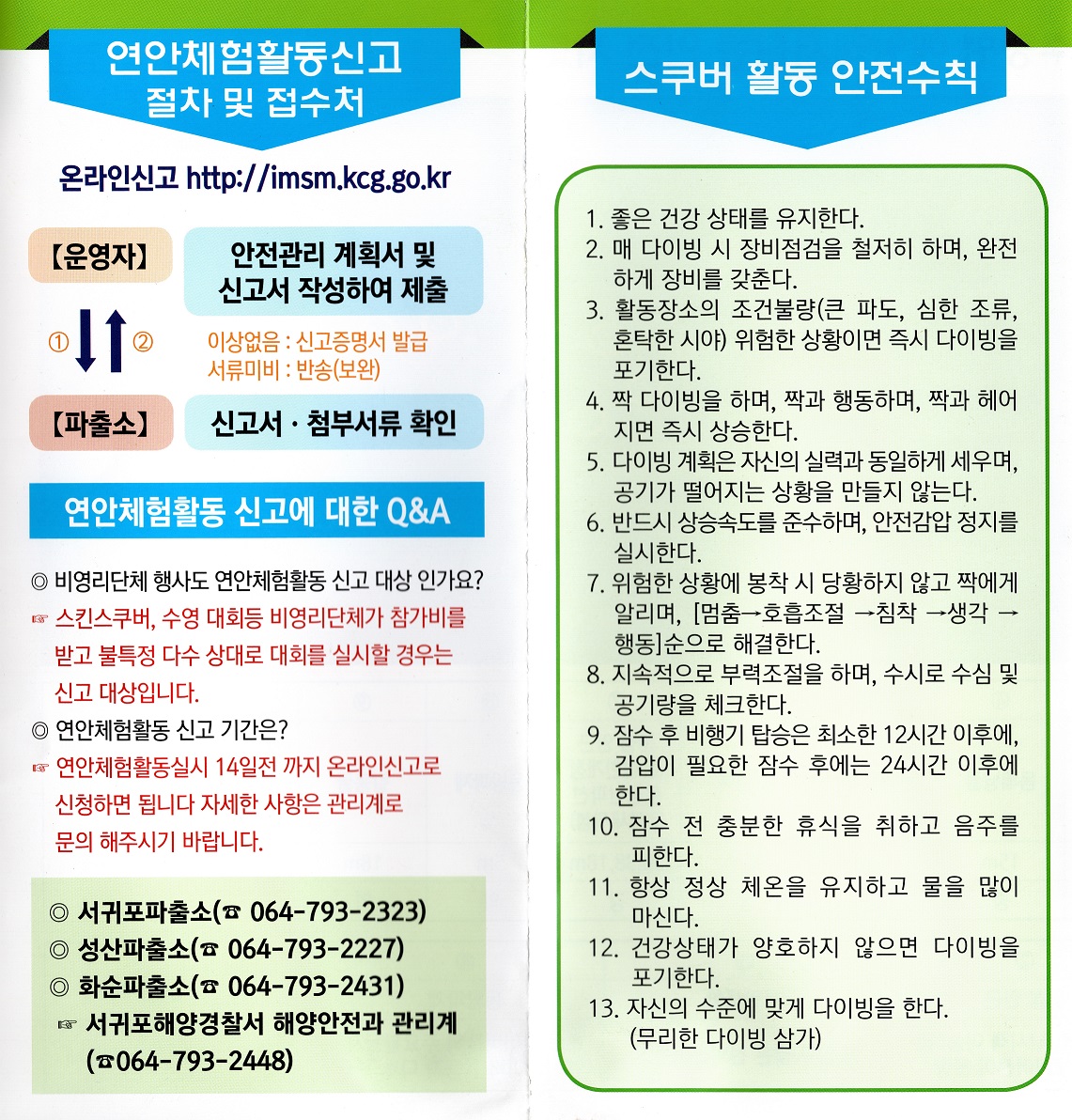 서귀포해경 관계자는 “수중레저나 연안활동 시 안전수칙을 반드시 준수하고, 사전에 개인의 건강상태 확인 후 이상 있을 시 활동을 삼가주시길 당부드린다”고 말했다.