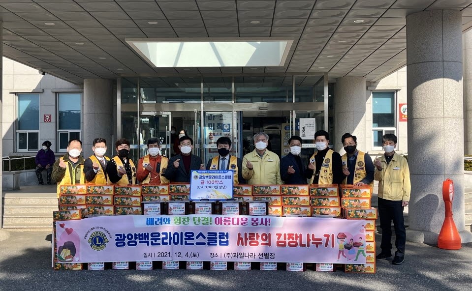 [해륙뉴스1]서정민기자=광양시 광양읍 광양백운라이온스클럽(회장 김진희)은 지난 7일 (재)광양시사랑나눔복지재단을 통해 광양읍 지역사회보장협의체(공공위원장 정은태, 민간위원장 허형채)에 귤 100박스와 김치 50통을 후원했다.