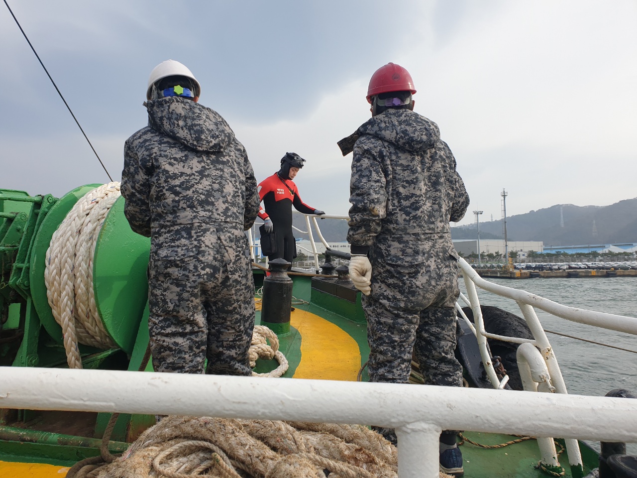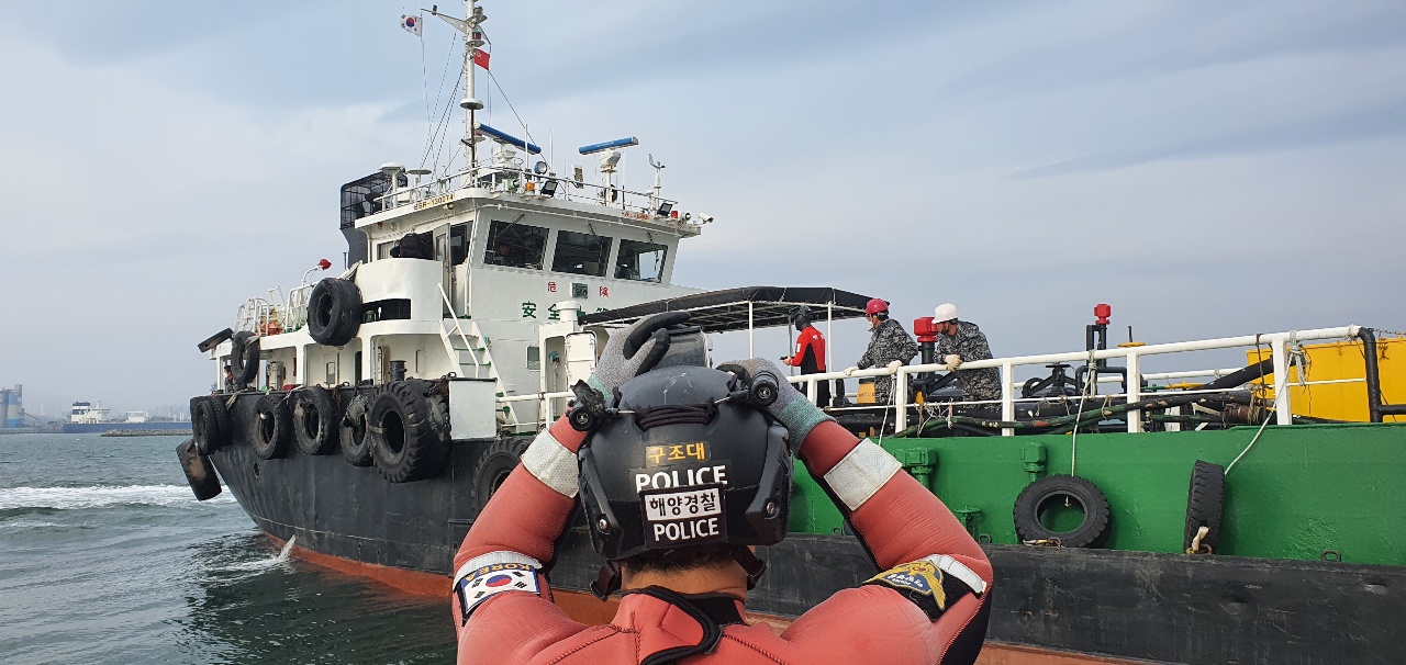 울산해경은 경비정 3척과 울산구조대, 울산항파출소 연안구조정을 급파하여 현장 확인한바 선저 파공이 없어 인명, 침수‧오염피해는 없었고 우선 긴급조치로 선박이 기우는 것을 방지하기 위해 D호의 왼쪽 선수와 선미쪽에 예인선홋줄을 이용 팽팽히 고정후 안전하게 예인작업을 실시하였으며.