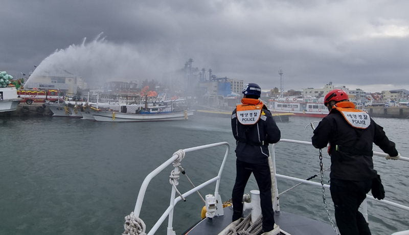 또한, 27일(월) 오후 2시에는 제주시 한림항에서 제주해경, 제주소방, 한림수협, 어촌계, 민간해양구조대 등이 모여 항 내 계류 중이던 어선에서 발생한 화재가 주변 선박으로 연쇄적으로 번져 집단 화재가 일어나는 상황을 가상으로 한 대응 훈련을 시행하였으며, 이번 훈련을 통하여 민·관 공동 대응체계 마련하고 각 관계기관 비상 상황 대응능력 및 임무를 강화하였다.