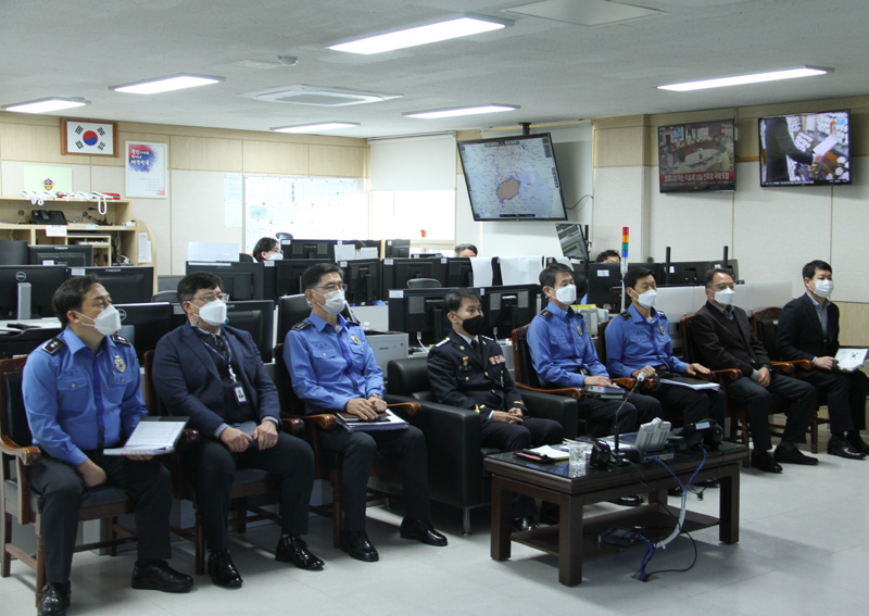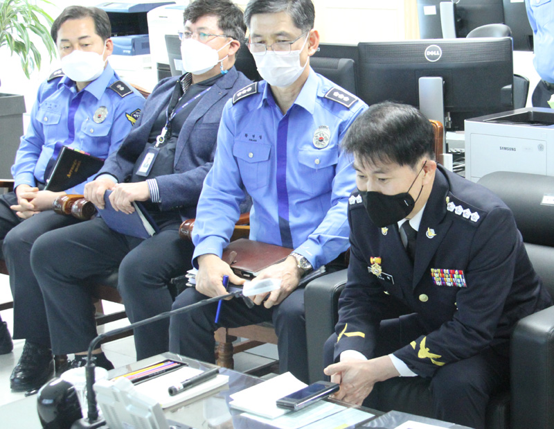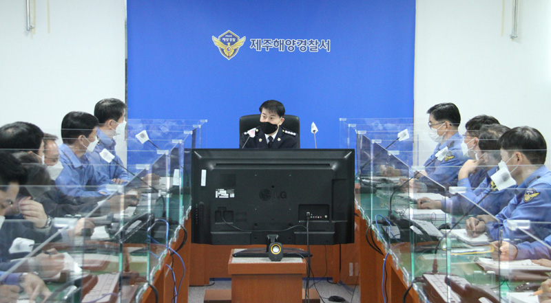 7일(금) 오후 제27대 제주해양경찰서장으로 새롭게 취임한 박상욱 신임 서장은 코로나 상황을 감안하여 취임 행사 없이 상황실에서 해양 치안 상황 브리핑을 듣고 제주 인근 해역을 경비 중인 3000톤급 경비함정과 영상통화를 하며 빈틈없는 해양 치안 업무에 고생하는 직원들을 격려하였다.