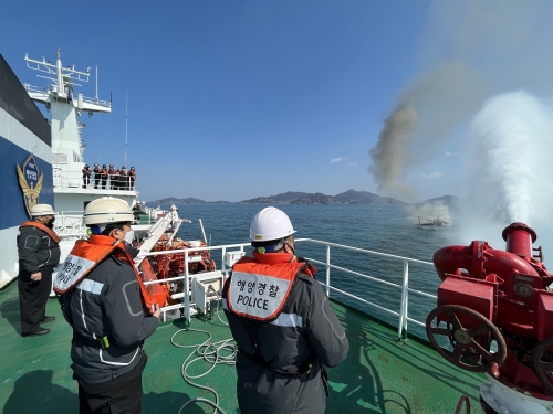항해 실습에 나선 해양경찰교육원 소속 실습함(바다로함)이 바다에서 실제 화재 선박을 접하고 현장에 긴급 투입...