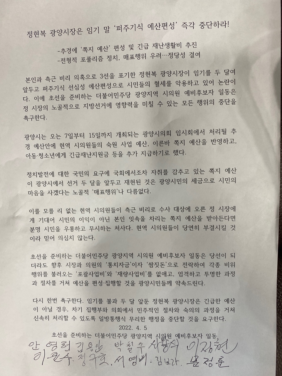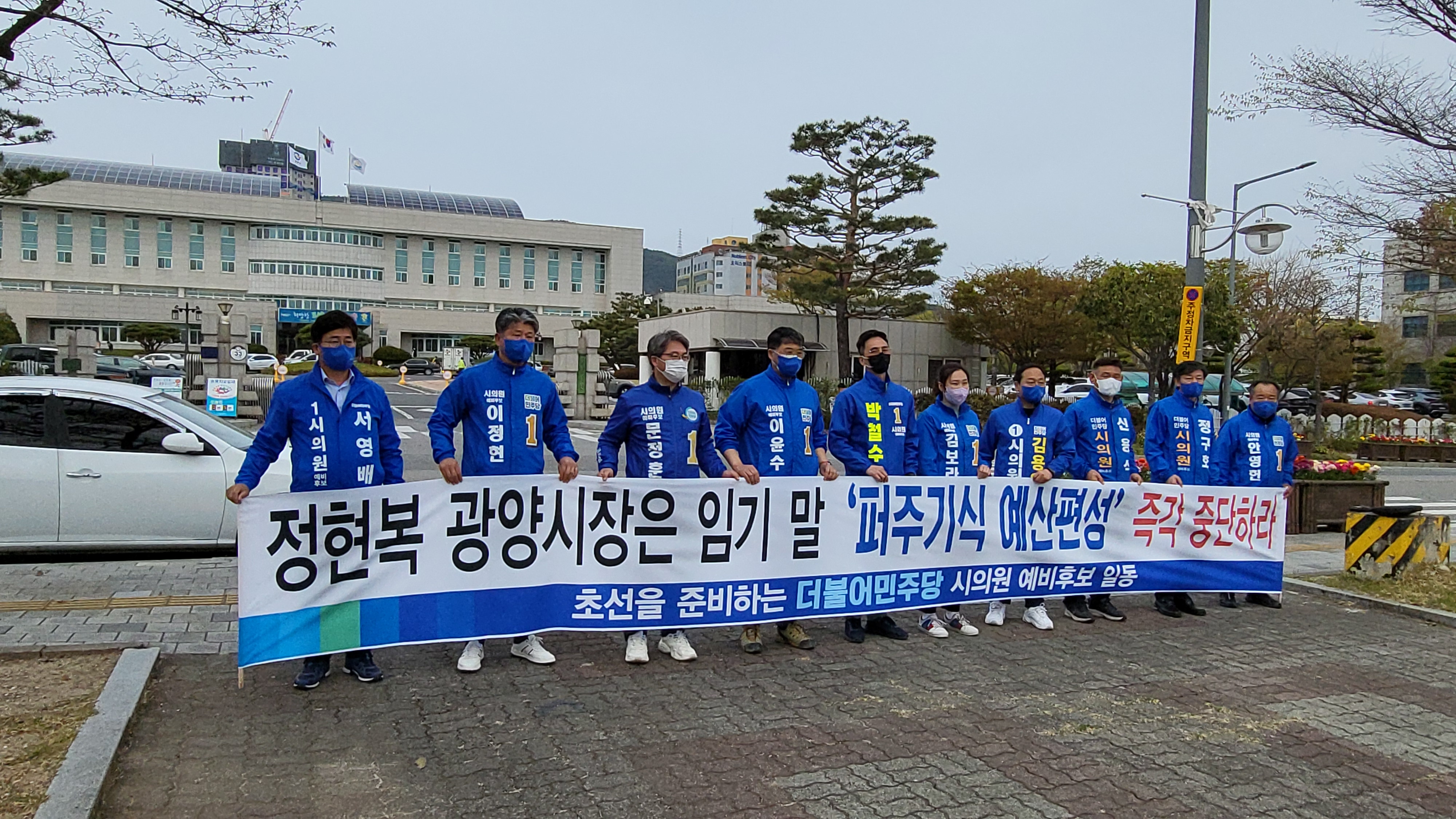 광양시가 6.1 지방선거 앞두고" 시의원들께 공사 추천받아" 추천한 시의원들의 현장에 배정했다는 소문과 그 대가로 긴급재난지원금 집행 보도자료 발표했다는 말들이 나돌아 광양시 초선을 준비하는 더불어민주당 시의원 예비후보들이 기자회견을 했다.