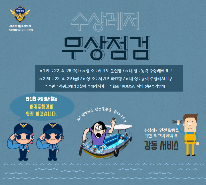 서귀포해양경찰서(서장 김진영)는 동력수상레저기구의 장비 고장으로 인한 사고를 예방하기 위해 서귀포시 대정읍 운진항(28일)과 하효동 하효항(29일)에서 「동력수상레저기구 무상점검 서비스」를 실시한다고 밝혔다.