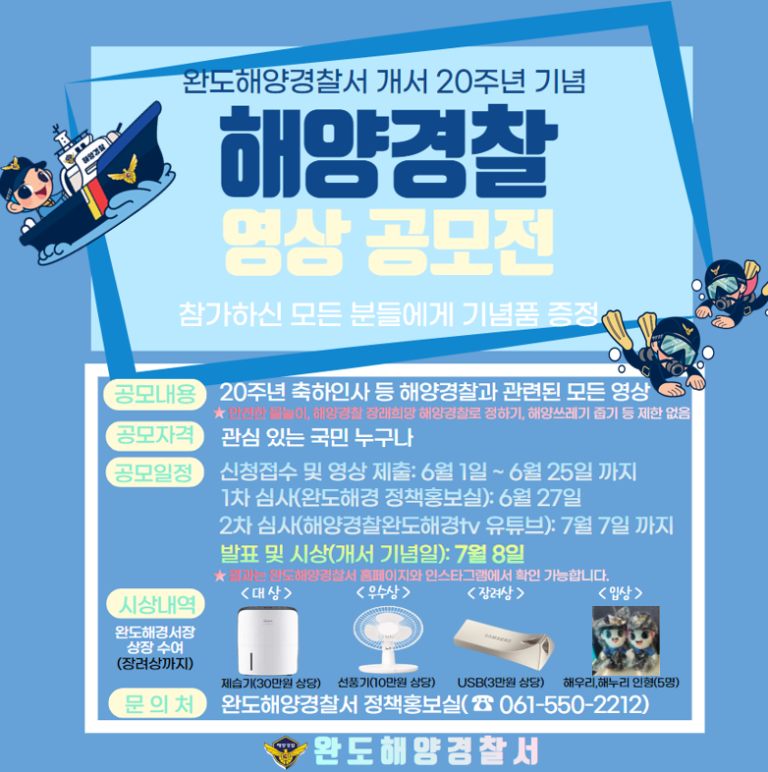 완도해양경찰서(서장 김정수)가 개서 20주년을 기념하며 ‘국민참여 해양경찰 영상공모전’을 진행중이다.