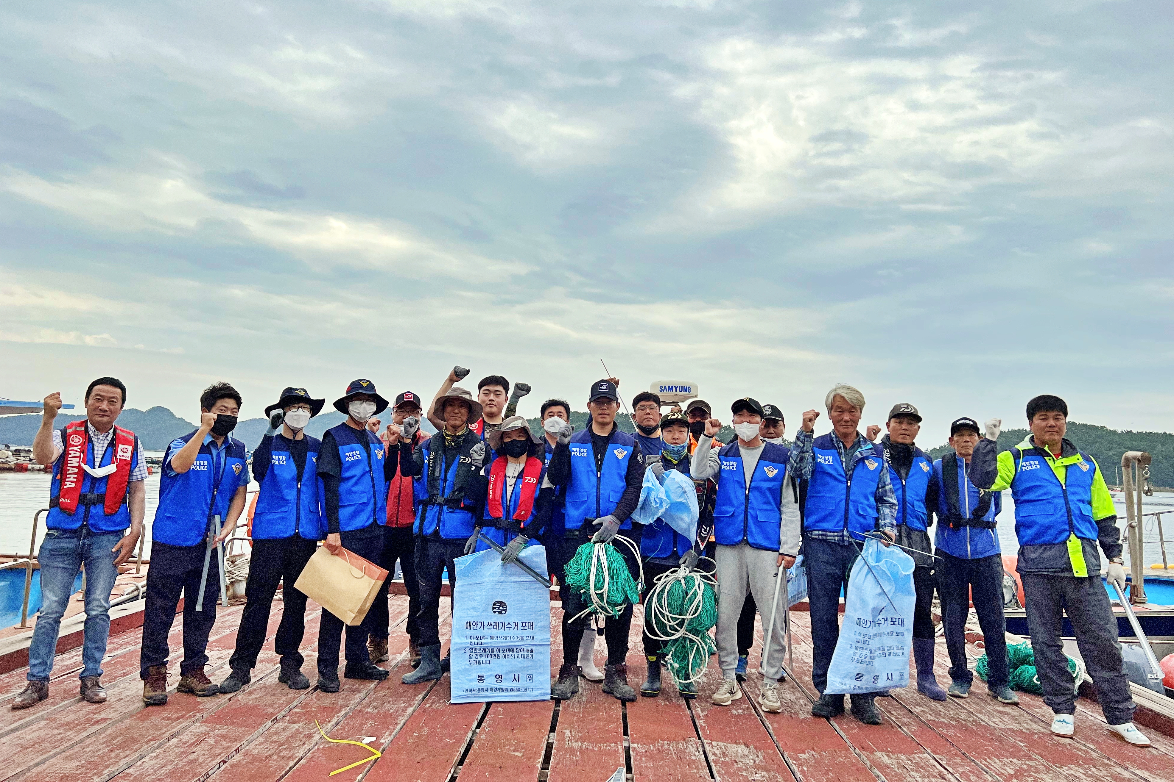 해상자율순찰대 임시 출범식에 맞춰 통영해경, 해상자율순찰대, 대한잠수협회 등 약 50여명과 선박 6척을 동원하여 통영시 오비도 인근 해상 정화활동을 실시하였다.