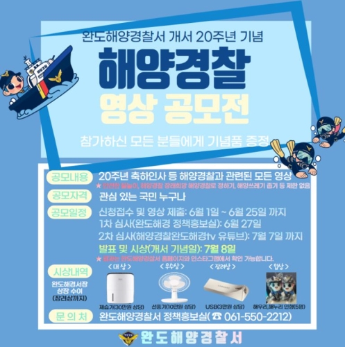 완도해양경찰서(서장 김정수)가 개서 20주년을 기념하며 ‘국민참여 해양경찰 영상공모전’을 진행중이다. ‘국민...