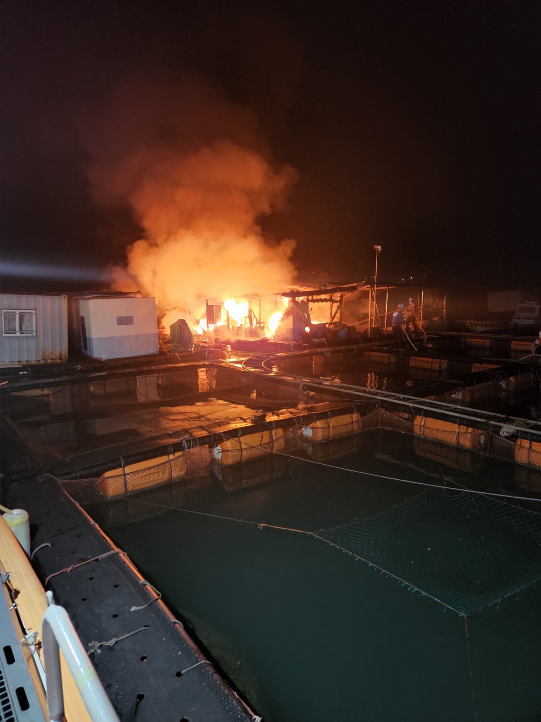 화재 양식장 안에는 사람이 없는 것으로 확인되어 양식장 직원들 도움으로 화재진화 중 경비함정에 탑승해 현장에 도착한 119 소방관들과 합동으로 화재진화에 나서 1시간여만에 화재를 진압했다.