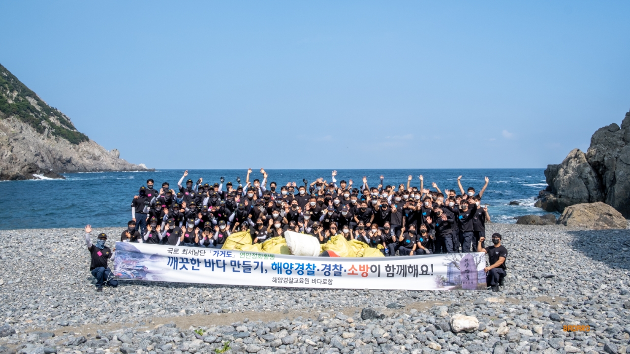 해양경찰교육원(원장 여인태) 소속 바다로함은 지난 19일 깨끗한 바다 만들기 캠페인 일환으로 해경, 경찰, 소방 등 3개 기관 간부후보생 100명이 국토 최서남단 가거도에 입도하여 연안 정화활동을 실시했다고 밝혔다.