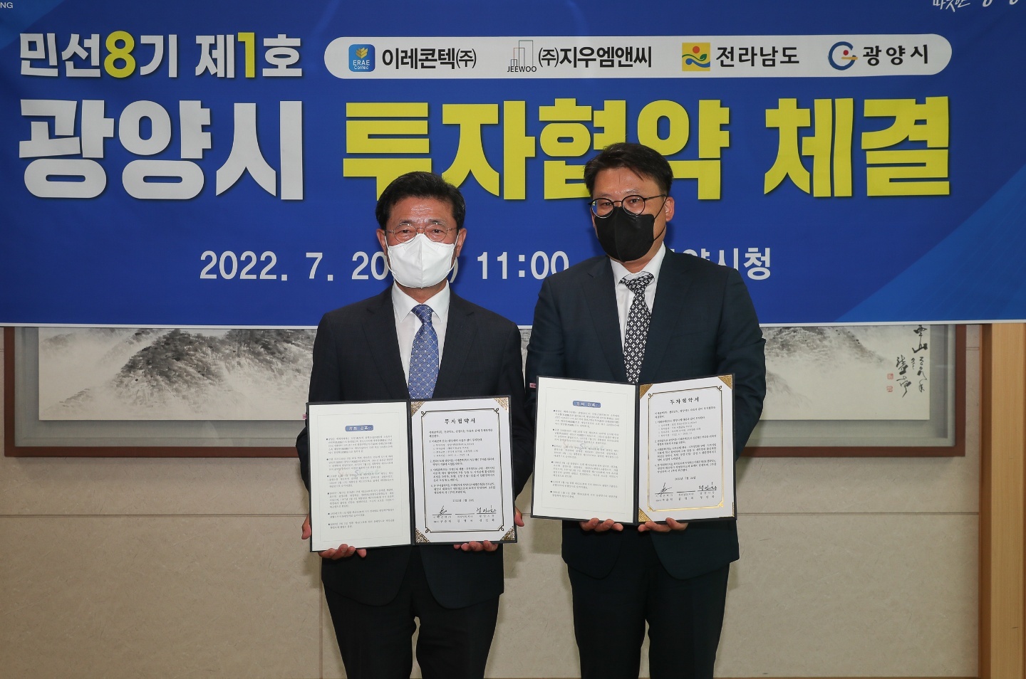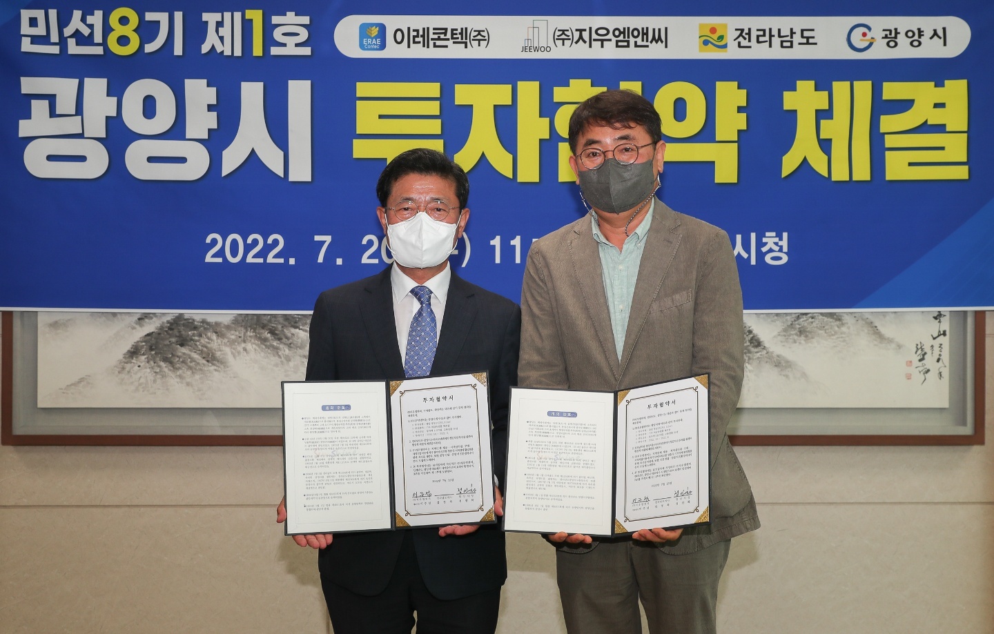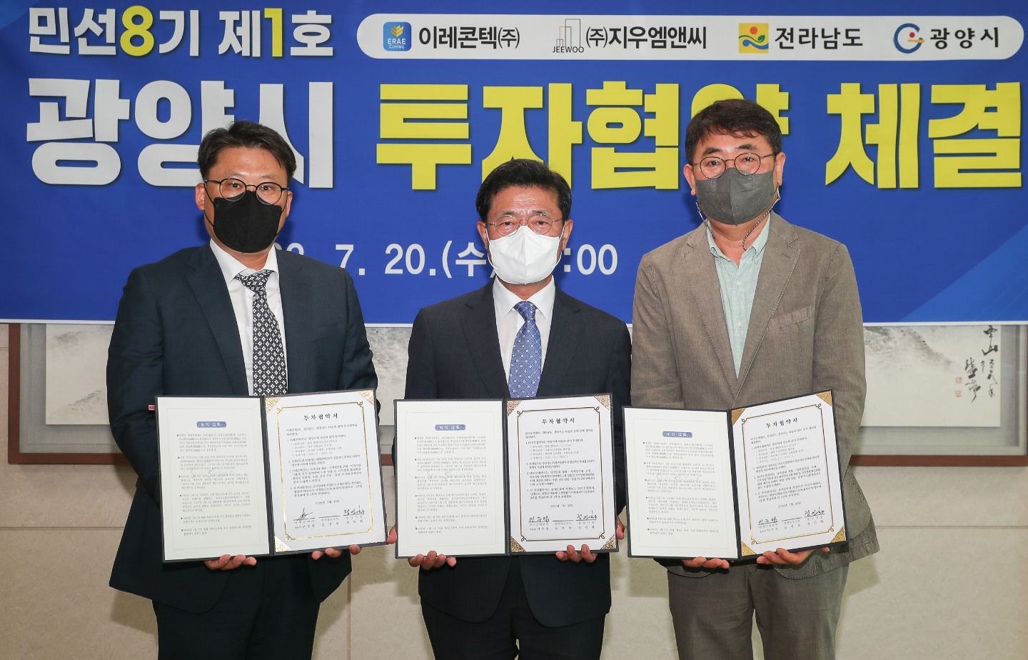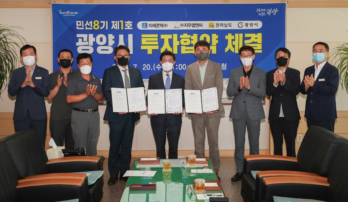 또한 금일(7월 20일) 11시경에 정 시장은 시청 접견실에서 이레 콘택트(주) (대표이사 구춘원), (주)지우 엠앤씨 (대표이사 이주성)와 총 투자액 201억 원, 고용 인원 41명 규모의 민선 8기 제1호 광양시 투자협약을 체결하였다.