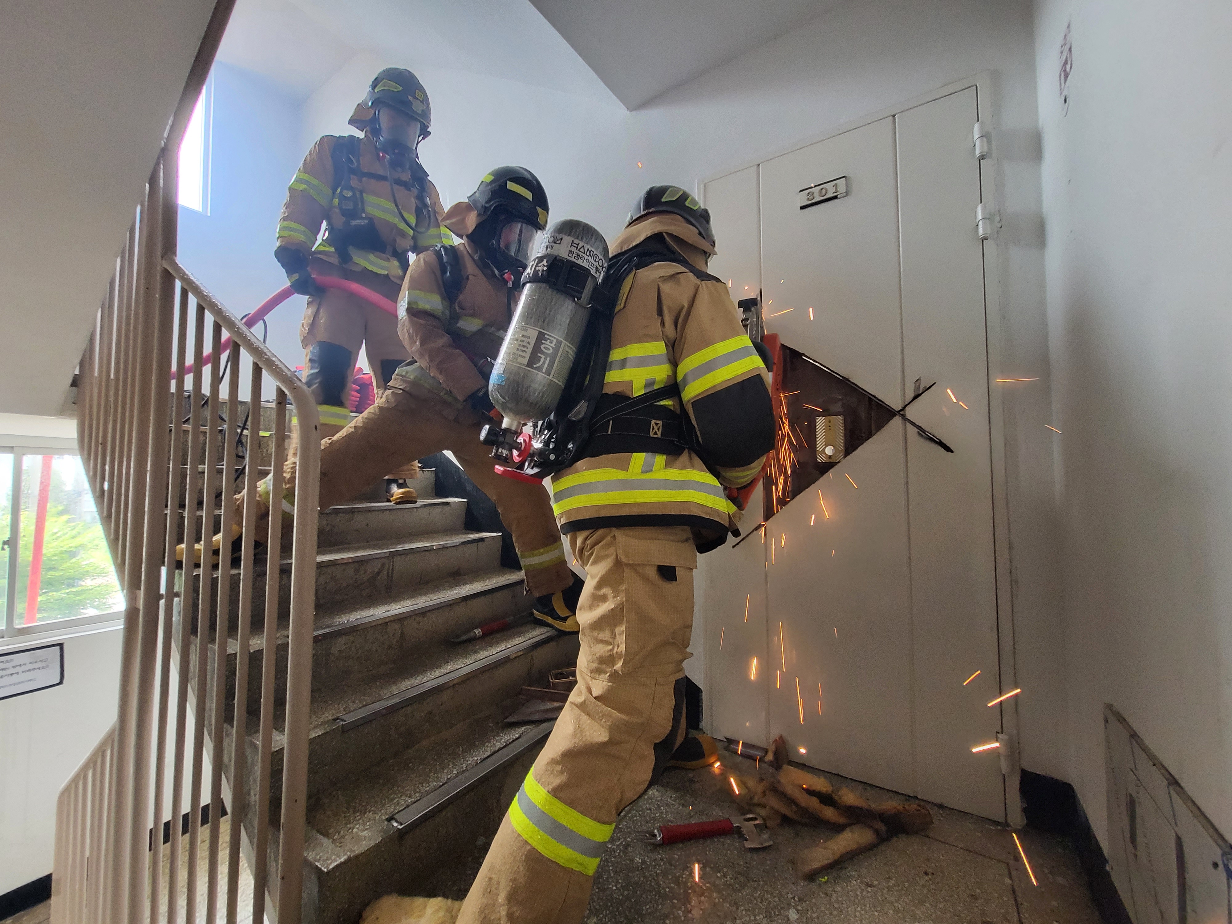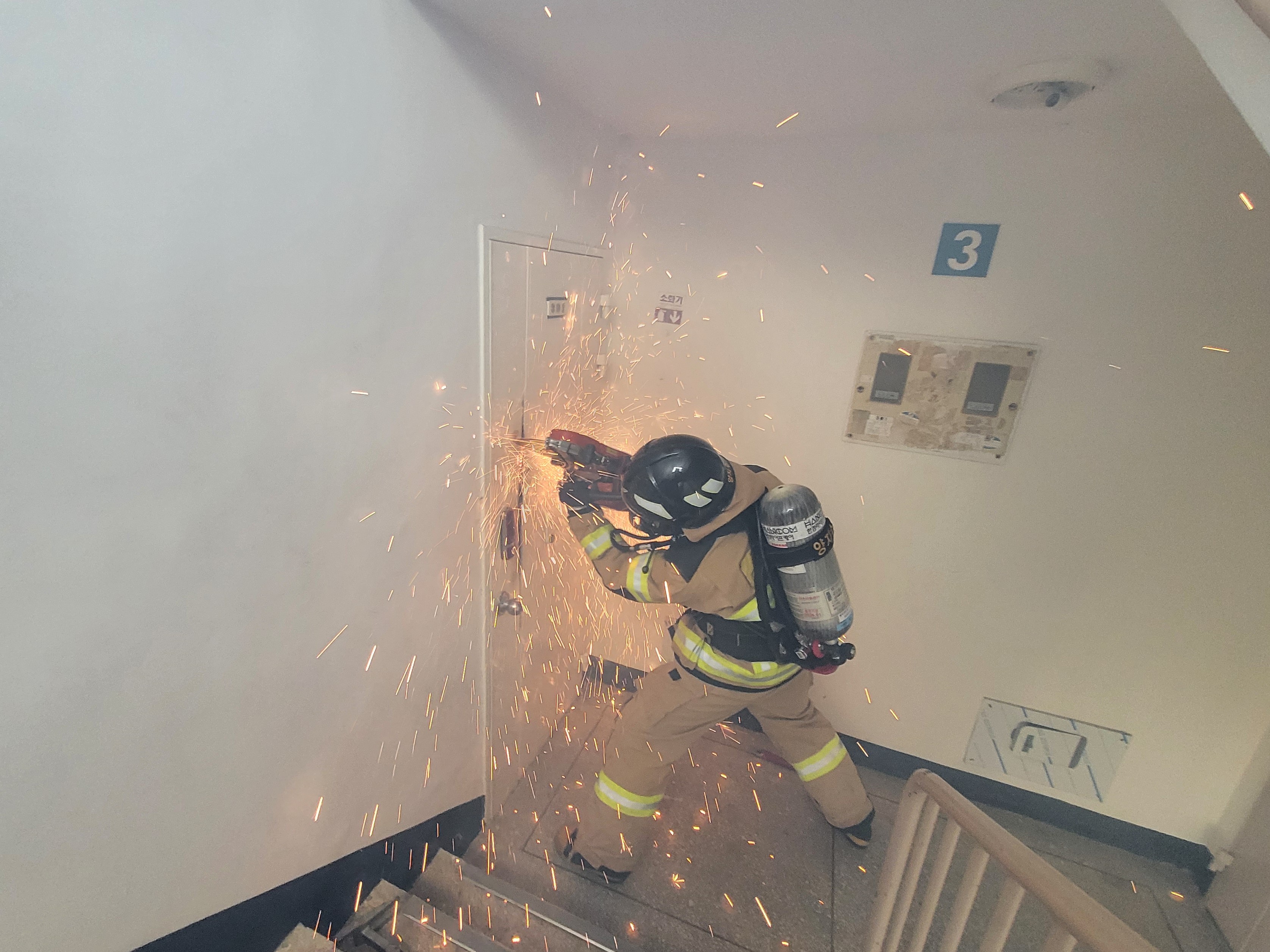 주요 훈련 내용은 ▲동력절단기를 이용한 방화문 절단 ▲문 개방 기구를 활용한 출입문 개방 ▲인명 검색 및 구조 방법 등 초기 대응 역량 강화에 중점을 두었다.