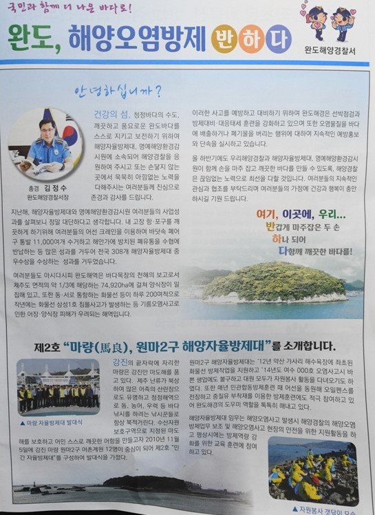 완도해양경찰서(서장 김정수)는 국민들에게 해양경찰서 해양오염 방제업무를 알리고, 민간 방제세력과의 협업 공감대를 형성하기 위해 해양오염방제 소식지 “반하다”를 제작 ㆍ 배포했다고 밝혔다.