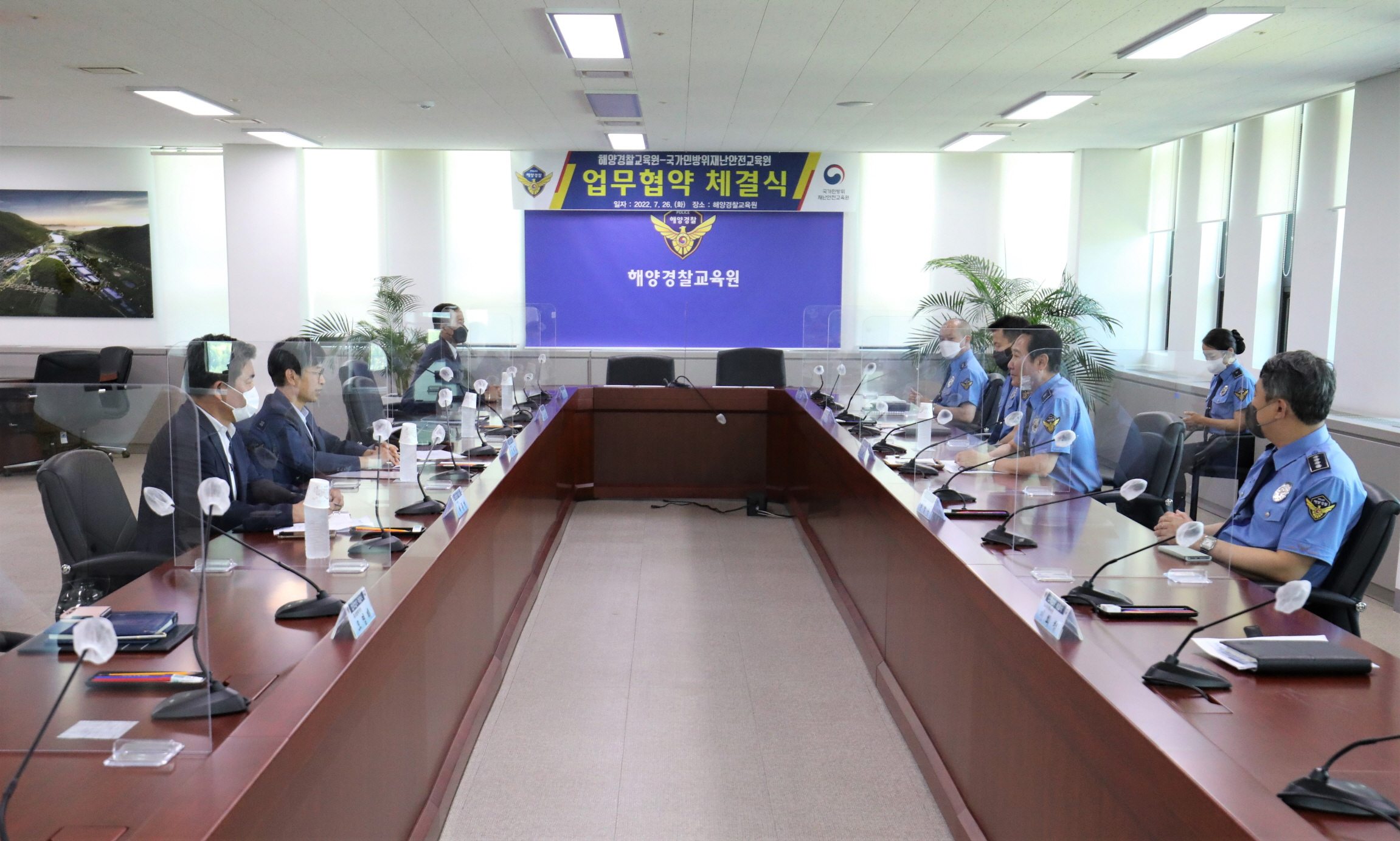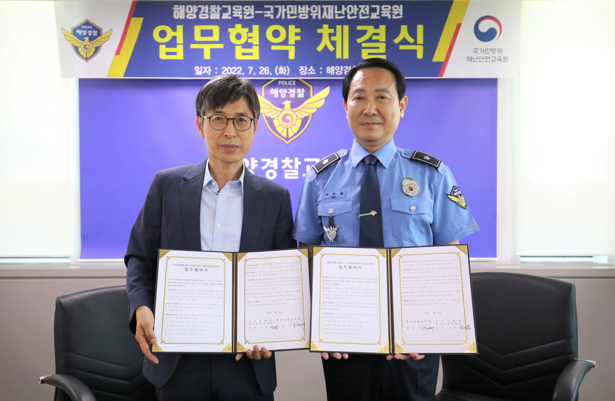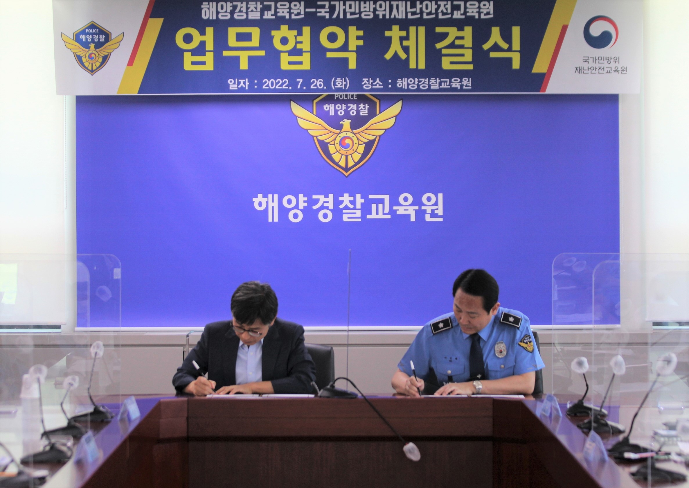 해양경찰교육원(원장 여인태)은 26일 14시 교육원 10층 대회의실에서 국가민방위재난안전교육원(원장 김재흠)과 재난안전분야 교류협력을 통한 상호 발전을 위해 업무협약을 체결했다고 밝혔다.