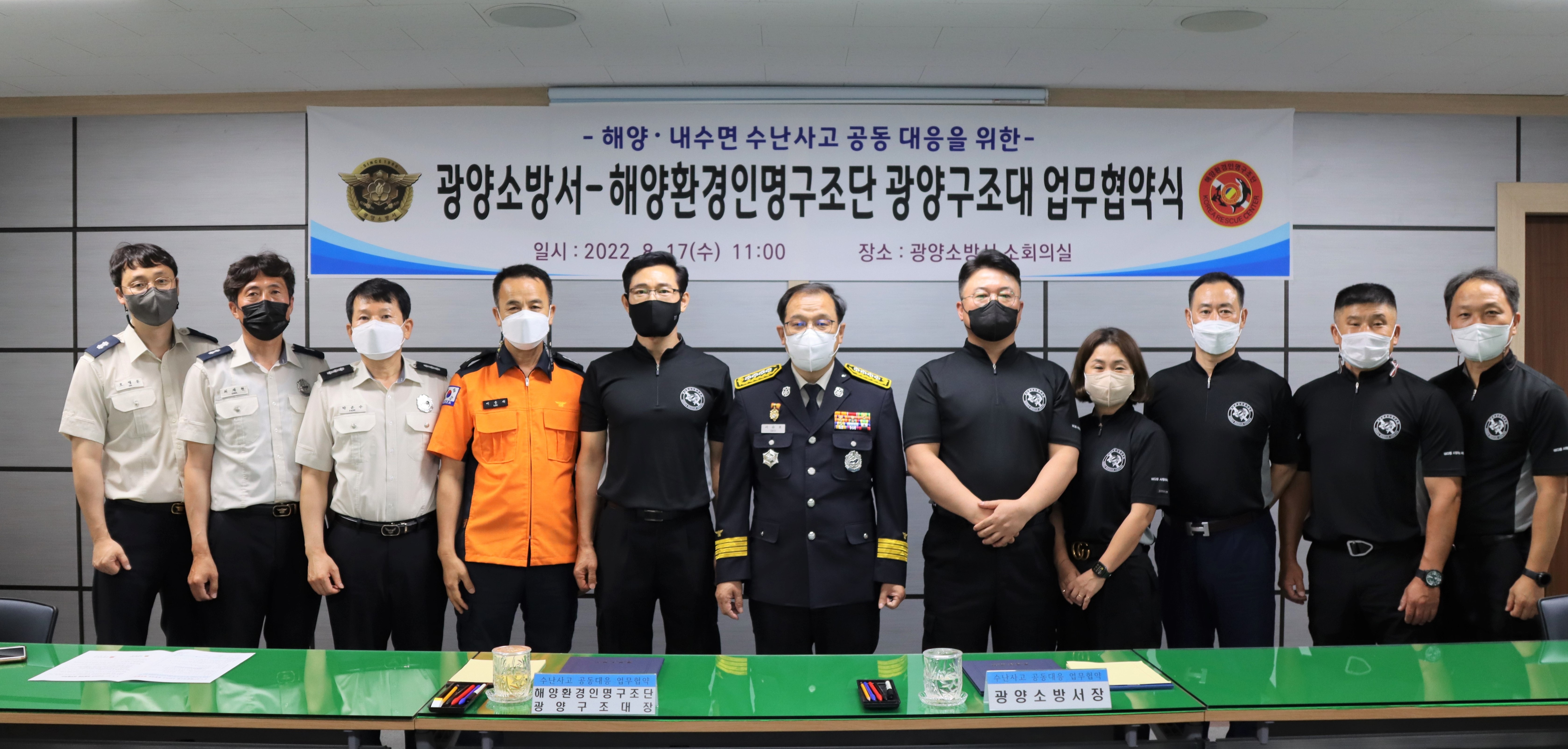 [해륙뉴스1]=서정민기자.광양소방서(서장 서승호)는 오늘(17일) 11시 광양만 및 섬진강과 백운산 계곡 등의 수난사고 대응을 위해 해양환경인명구조단 광양구조대와 광양소방서가「해양․내수면 수난사고 공동대응 업무협약식」을 가졌다고 전했다.
