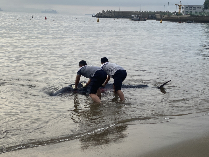 [해륙뉴스1]김동환기자=여수해양경찰서(서장 박제수)는 “여수 모사금해수욕장 해변에 밀려 좌초된 새끼 향고래(추정)를 해양경찰관들이 바다로 밀어 넣어 돌려보냈다”고 22일 밝혔다.