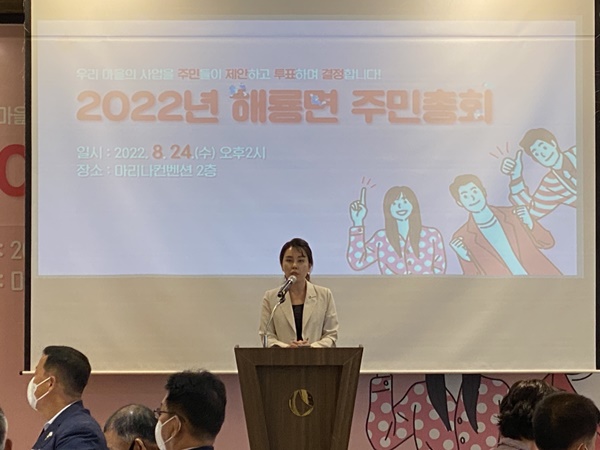 전남도의회 한숙경 의원(더불어민주당, 순천7)은 지난 24일, 순천시 마리나컨벤션에서 열린 해룡면 주민총회에 참석해 마을공동체의 왕성한 활동을 기대하며, 풀뿌리 자치의 모범이 될 수 있도록 격려와 함께 아낌없는 지원을 약속했다.