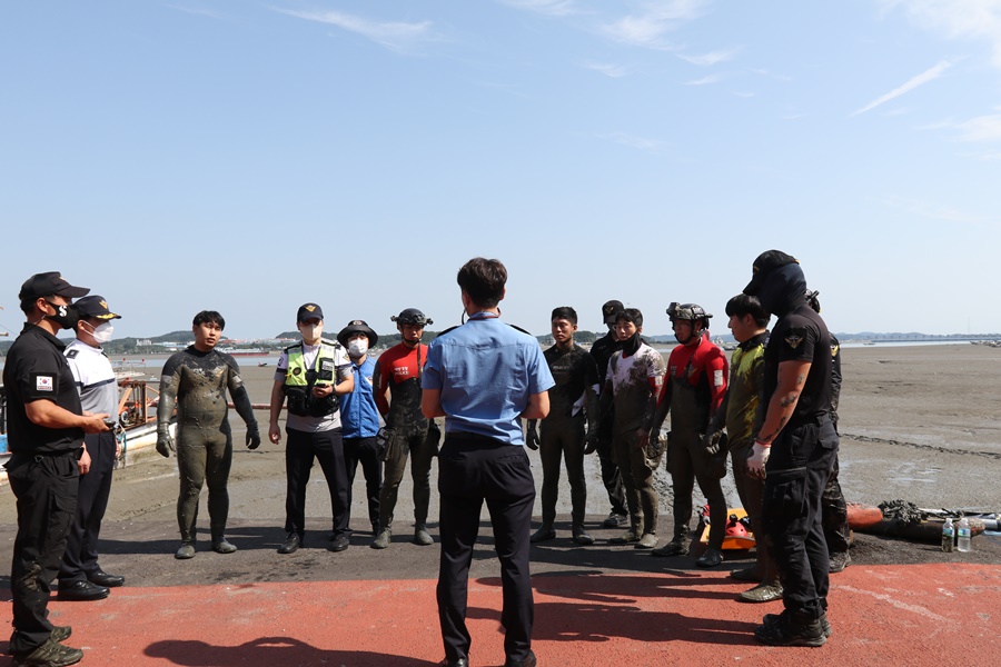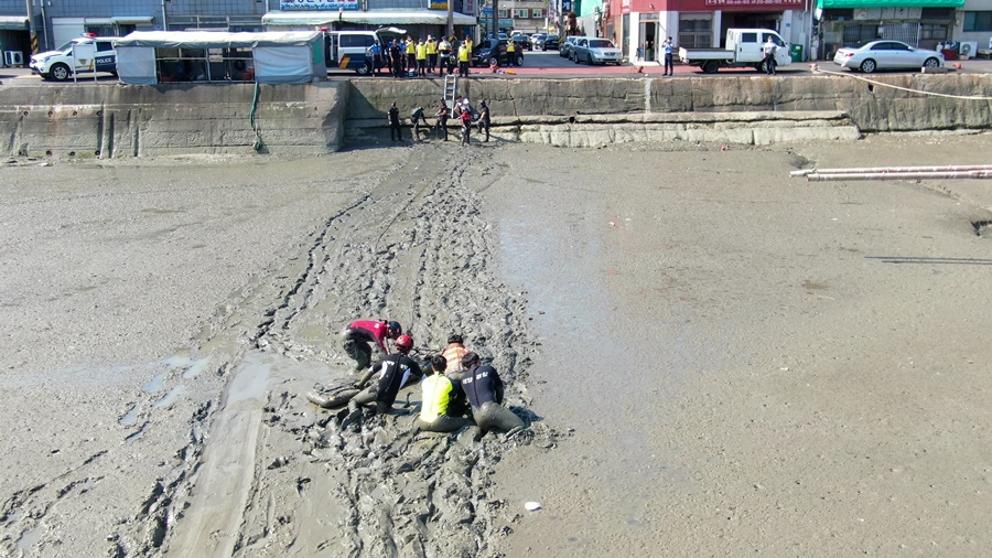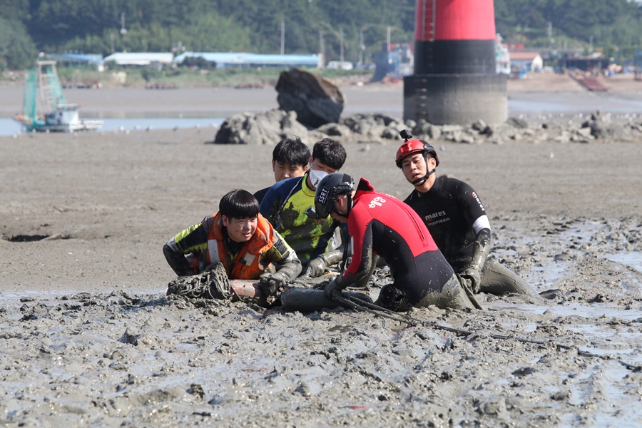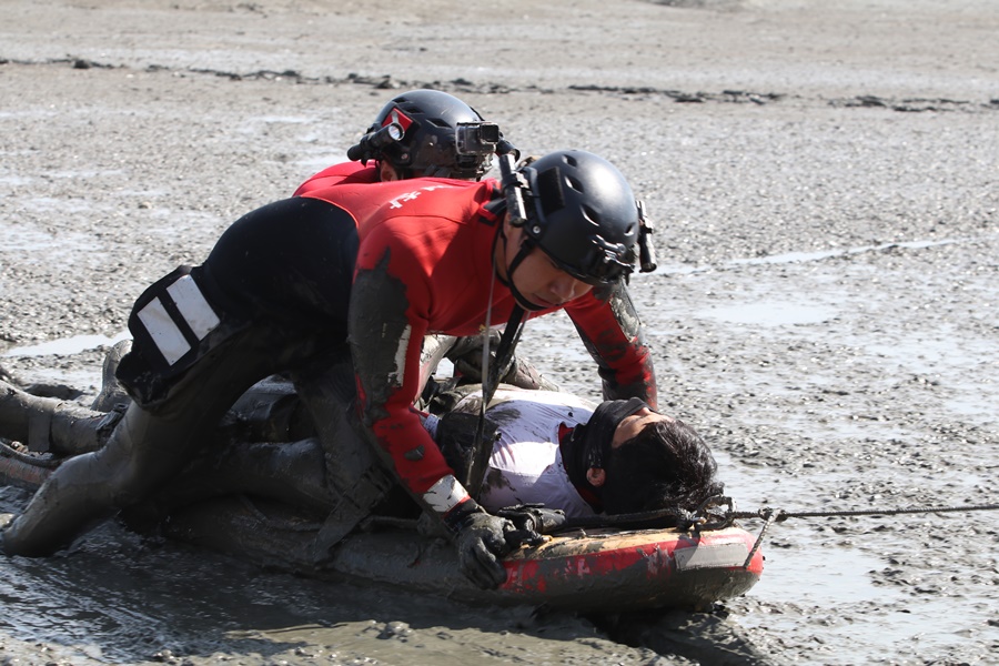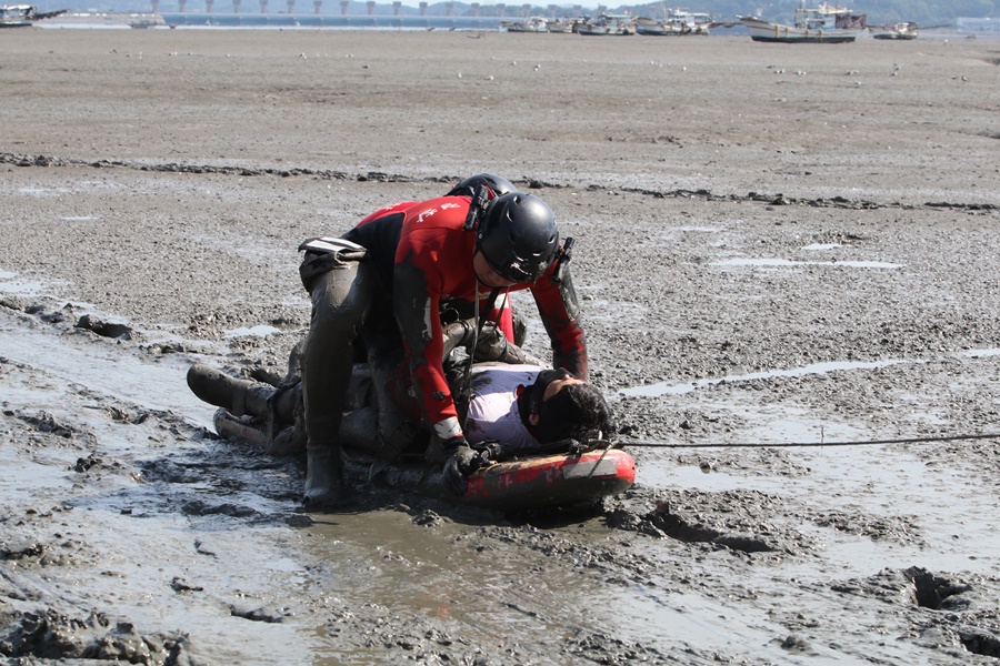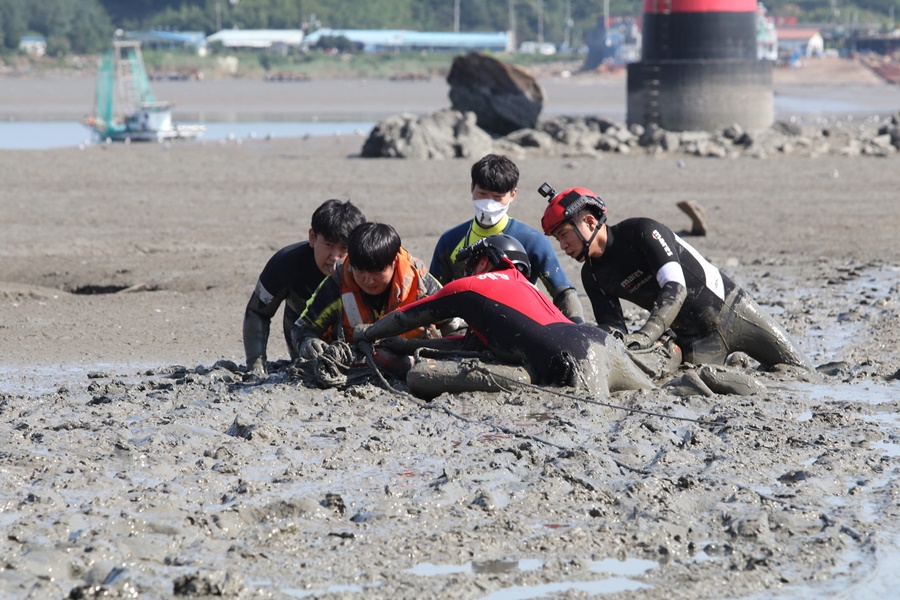 이날 훈련은 관광객이 갯벌에 밀물에 고립되는 상황을 가정해 ▲수색용 드론을 활용한 고립자의 위치 파악 ▲구조보드를 활용한 이동 및 구조 ▲고립자 부상처치 및 이송 ▲갯골 위치 파악 및 현행화 등을 중점으로 실시 됐다.