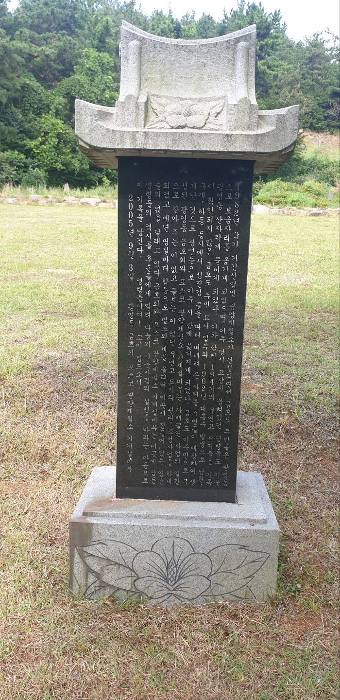 1982년 국가 기간산업인 광양제철소가 건설되면서 금호도 주민들은 광영동(당시 옥곡면)으로 보금자리를 옮기게 되었으며, 이주 당시 고향에 묻혀있던 영령들도 이곳 광영동 산자락에 묻히게 되었다. 이와 함께 194기의 무연고 묘지들은 가족이 확인되지 않은 금호도 주민 묘지 일부와 1962년 대홍수 발생으로 남원, 구례, 하동 등지에서 섬진강 물을따라 떠내려온 사체를 주민들이 매장하여 생겨난 것으로 광영동으로 이주 시 함께 옮겨지게 되었다.