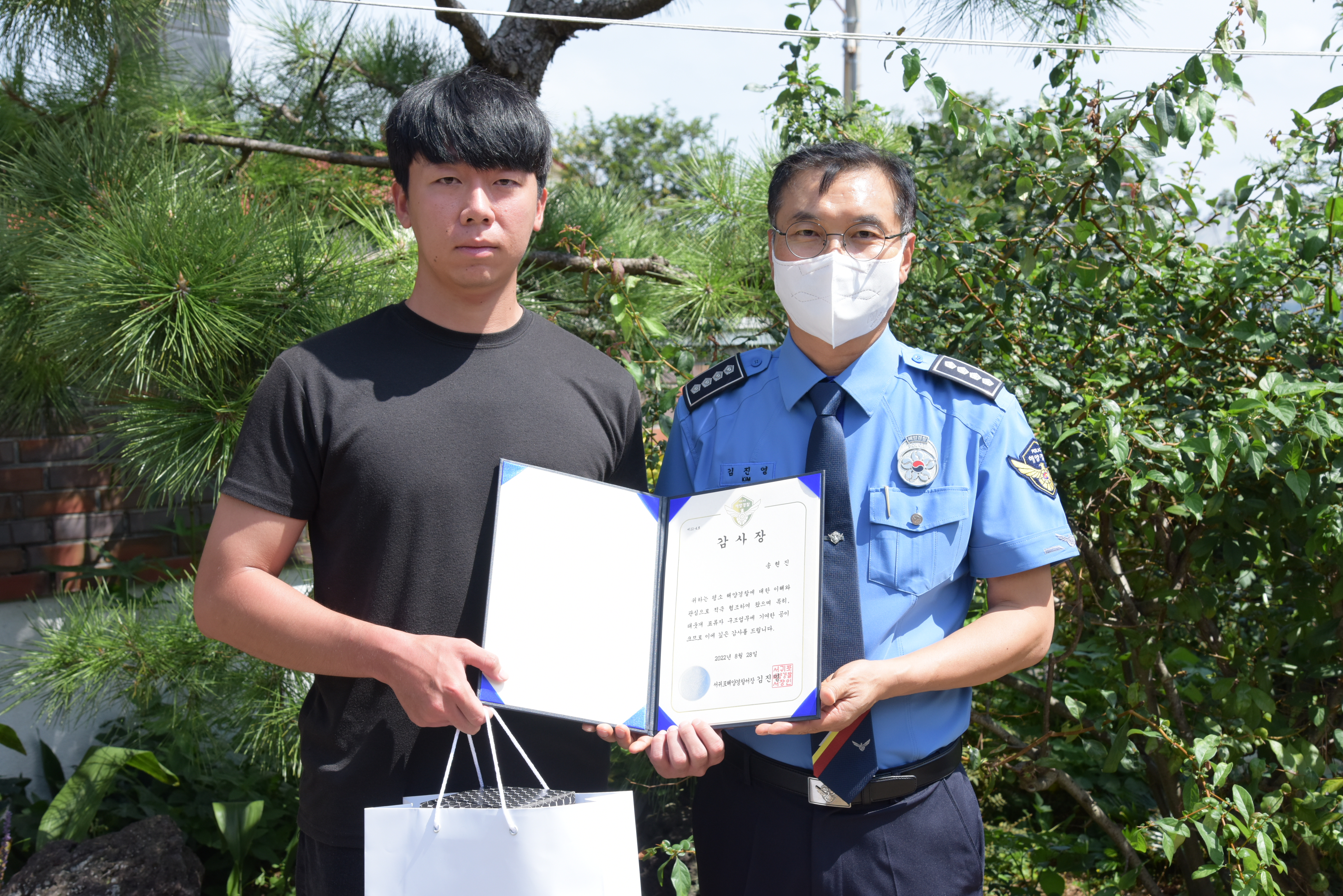 서귀포해양경찰서(서장 김진영)는 지난 25일 서귀포시 남원읍 태웃개 익수사고 시 가장 먼저 구조활동에 나선 송현진(25세, 남, 남원읍) 씨에게 용감하고 의로운 구조활동에 대한 감사장을 전달했다고 밝혔다.