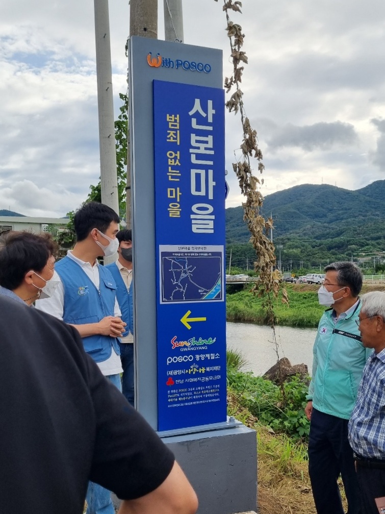 특히 과학기술 봉사단에서 마을 입구 범죄 없는 입간판을 설치했는데 포스코 연구원에서 개발한 첨단 기술인 고해상 프린트가 가능한 포스 아트(posART) 기술을 활용해 제작한 반영구적인 간판이다.