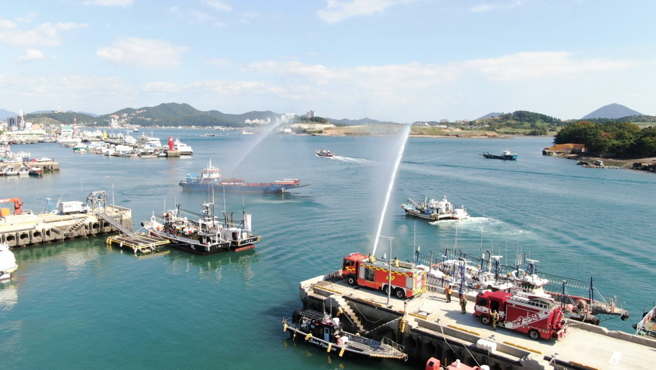 이번 훈련은 민관합동 화재진압 훈련으로 소방차가 접근할 수 없는 도서 지역이나, 해상에서 화재가 발생했을 경우를 대비해 민간선박인 화물선에 소방차를 선적시켜 해상으로 이동해 선박 화재를 진압하는 고난도의 훈련을 진행했다.