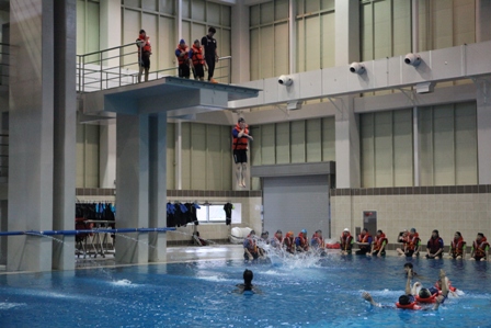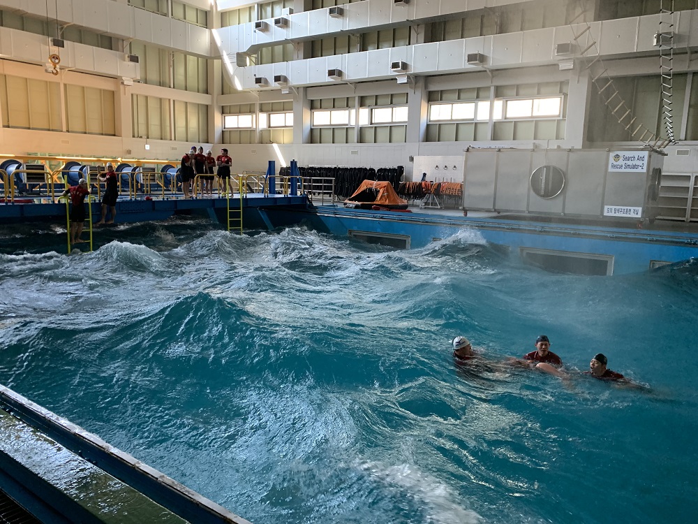 연구원들은 수영복이 아닌 실제 선박 근무용 복장을 입은 상태로 수상에서 안전지역으로 이동하기, 생존수영 및 뒤집힌 고무보트 내 에어포켓 경험과 수중 비상탈출 교육 등 기초적인 생환요령을 배웠다.