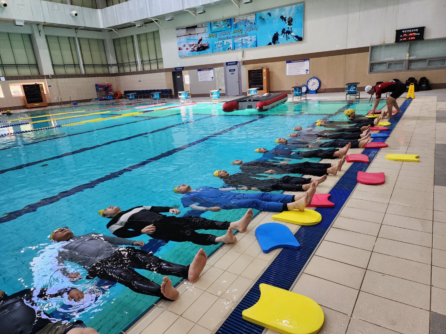교육원에 따르면 이날 교육은 연구원들이 연중 해양조사선에 승선하여 어장·해양환경 조사를 수행 중으로 해상추락·익수사고가 발생할 경우 자력으로 해상에서 생존할 수 있는 역량을 확보하기 위해 마련된 것으로 남해수산연구소 연구원 32명이 참여하였다.