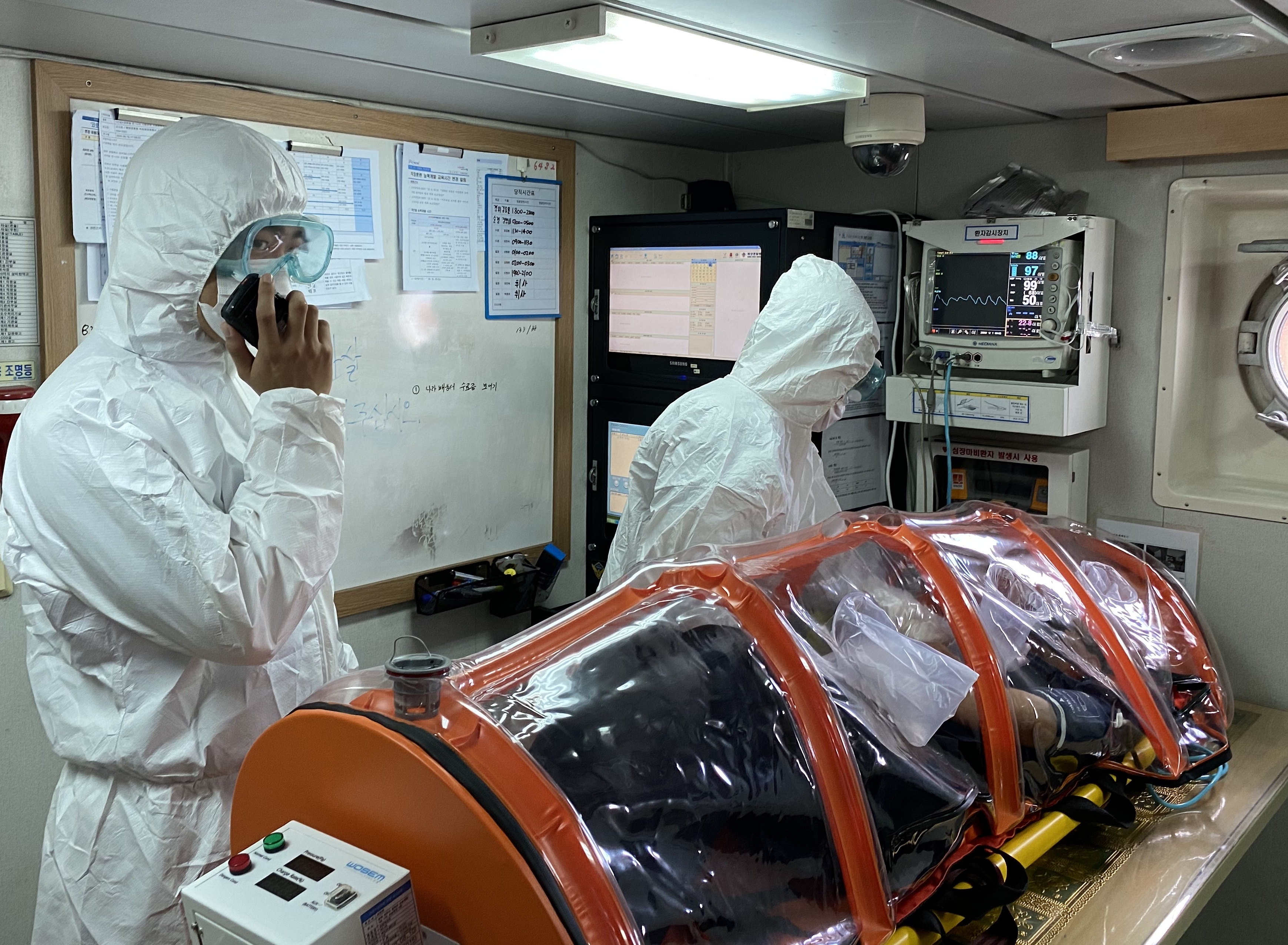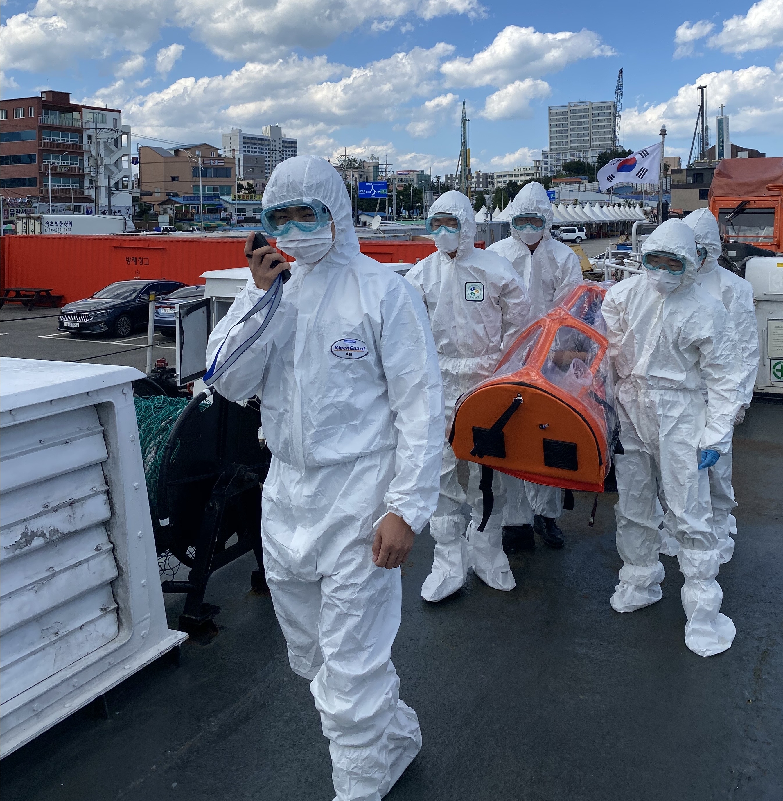 먼저 밀폐된 공간 등 상대적으로 감염에 취약한 경비함정의 경우 매일 함정소독 등 자체 방역활동을 강화하고 격리공간 확보를 통해 직원 간 전파 가능성에 대비하고 있으며, 현재 감염환자 이송에 대비한 음압들 것을 배치 완료한 상태이다.