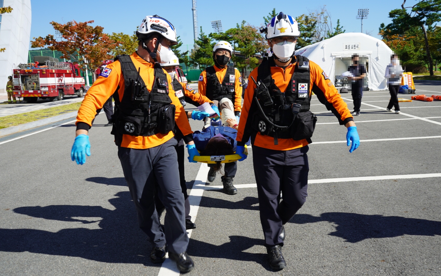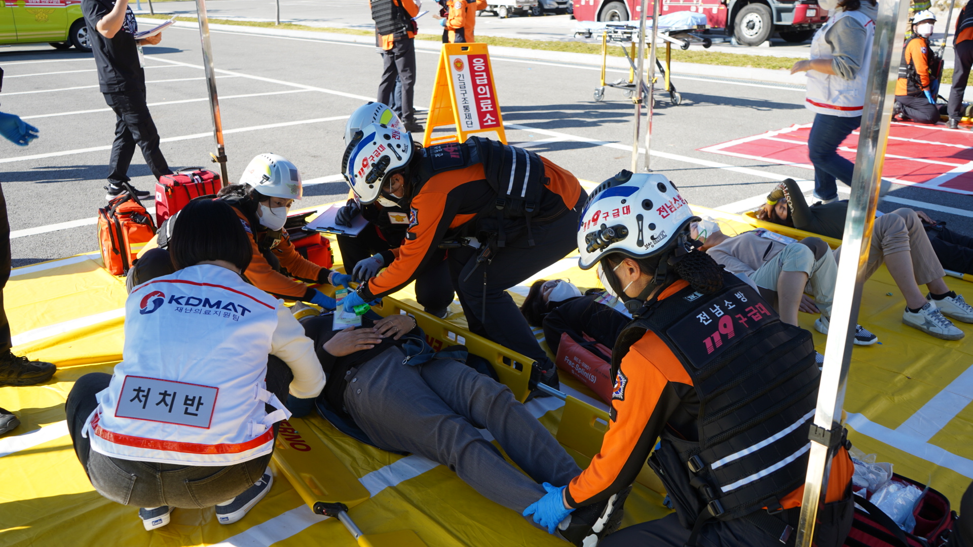 훈련 순서는 ▲선착 구급대 초기대응(임시의료소 운영) ▲통제단 및 현장응급의료소 설치 ▲중증도 분류 ▲응급처치 ▲환자이송 ▲훈련강평 순으로 진행됐다.