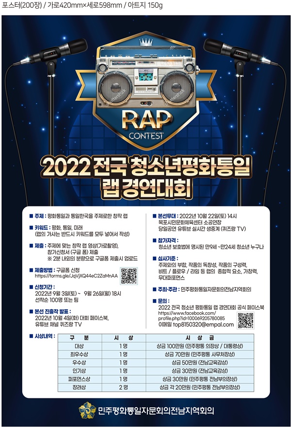 민주평통자문회의 전남지역회의는 22일 오후 2시 목포시민문화센터에서 제5회 전국 청소년 평화통일 랩 경연대회를 개최한다.