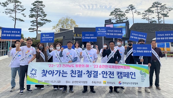 전라남도는 21일 순천만국가정원 일원에서 ‘2022~2023 전라남도 방문의 해’와 ‘2023 순천만국제정원박람회’ 성공 개최를 위한 관광 수용태세 확립 캠페인을 펼쳤다.
