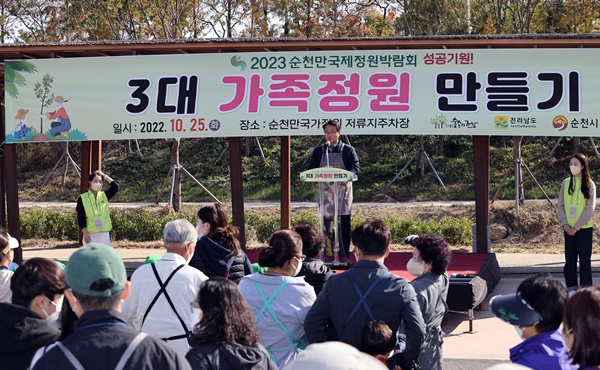 행사를 주관한 황금영 (사)숲속의 전남 이사장은 “화창한 가을 날씨에 2023 순천만국제정원박람회 성공개최 기원 3대 가족정원 만들기를 함께해 매우 기쁘다”며 “생활 속 나무심기 운동을 계속 추진해 도민의 행복과 삶의 질 향상에 기여하겠다”고 말했다.