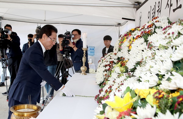 김영록 전남도지사는 이날 오전 도청 실국장들과 함께 합동분향을 했다. 김 지사는 조문록에 “희생자분들의 명복을 빌며 편히 영면하시기를 기원합니다”라고 적었다.