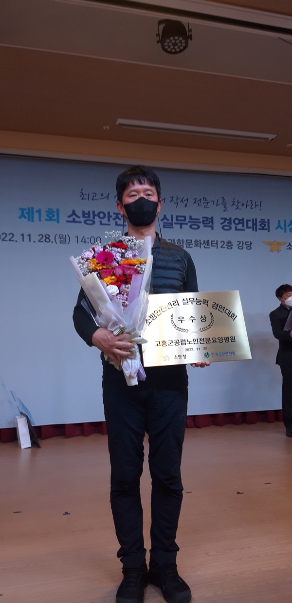 고흥소방서(서장 문병운)는 지난 28일 대전IBS과학문화센터에서 ‘제1회 소방안전관리 실무능력 경연대회’에서 2급분야 우수상을 수상한 고흥군공립노인전문요양병원에게 상장 및 상금 수여식이 있었다고 밝혔다.