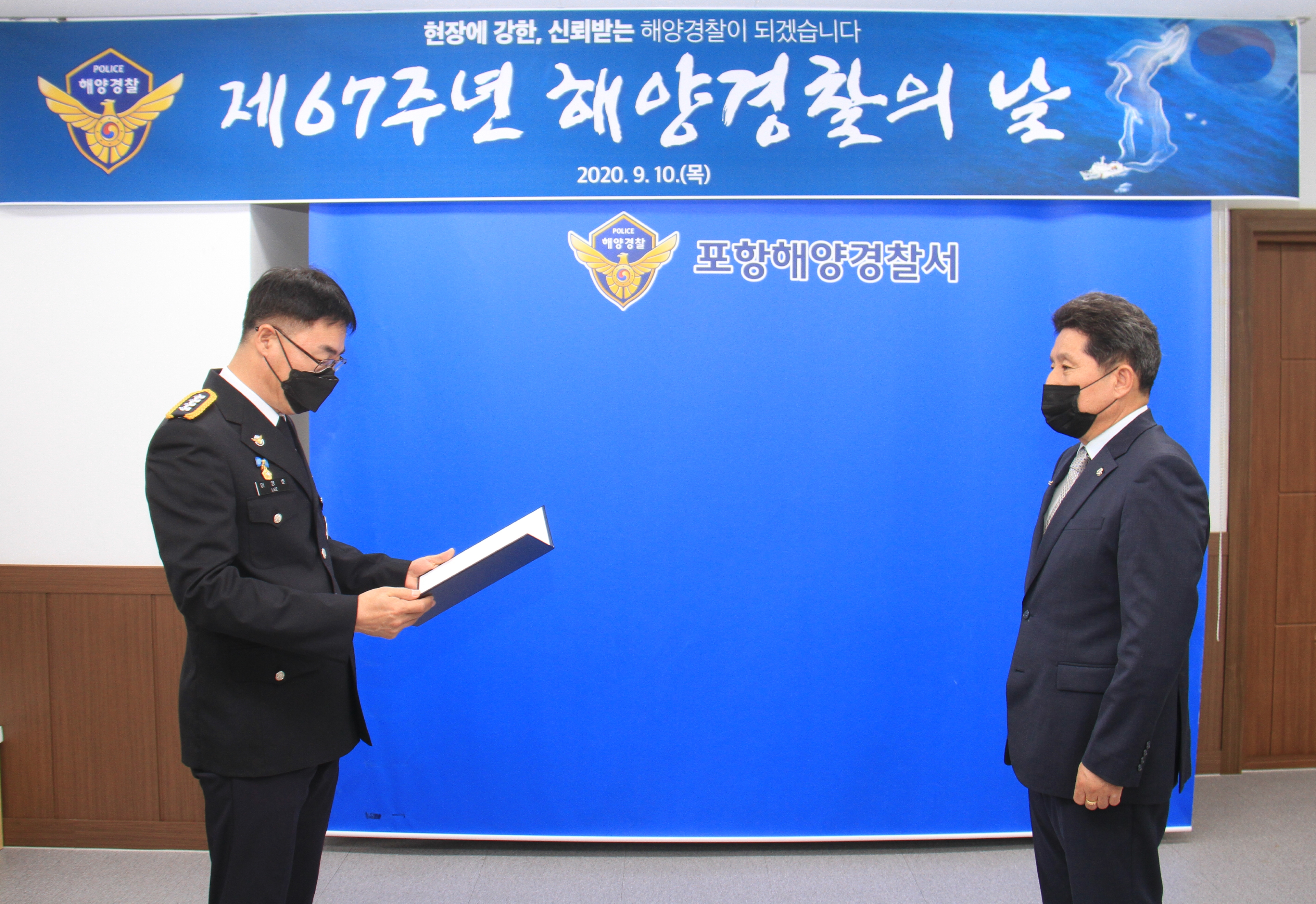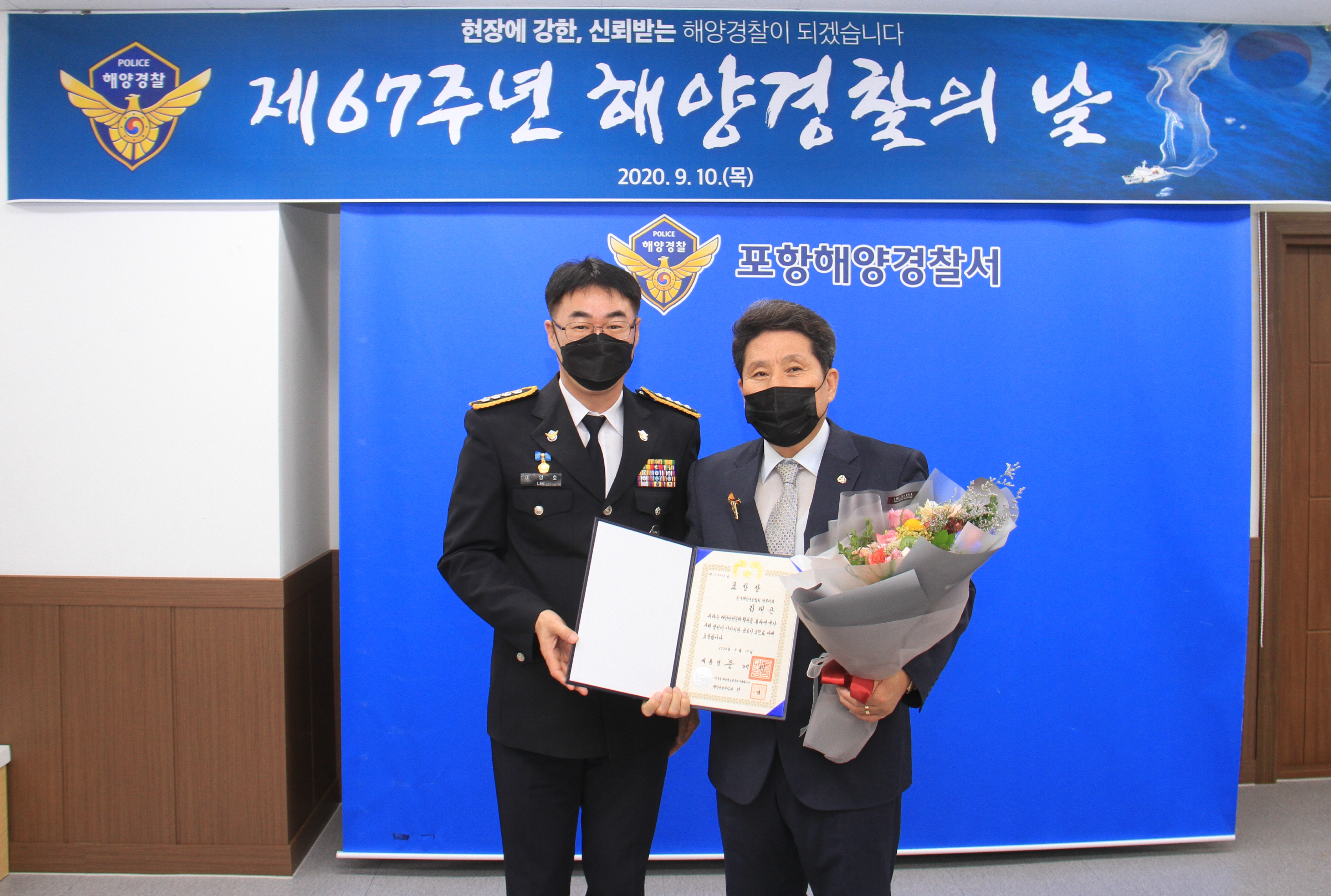 이에 제67주년 해양경찰의 날을 맞이하여 포항해양경찰서에서 표창을 전달받았다.