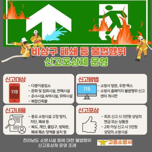 전남 고흥소방서(서장 문병운)는 화재, 재난발생을 대비해 소방시설 등에 대한 불법행위 신고포상제를 운영한다고...