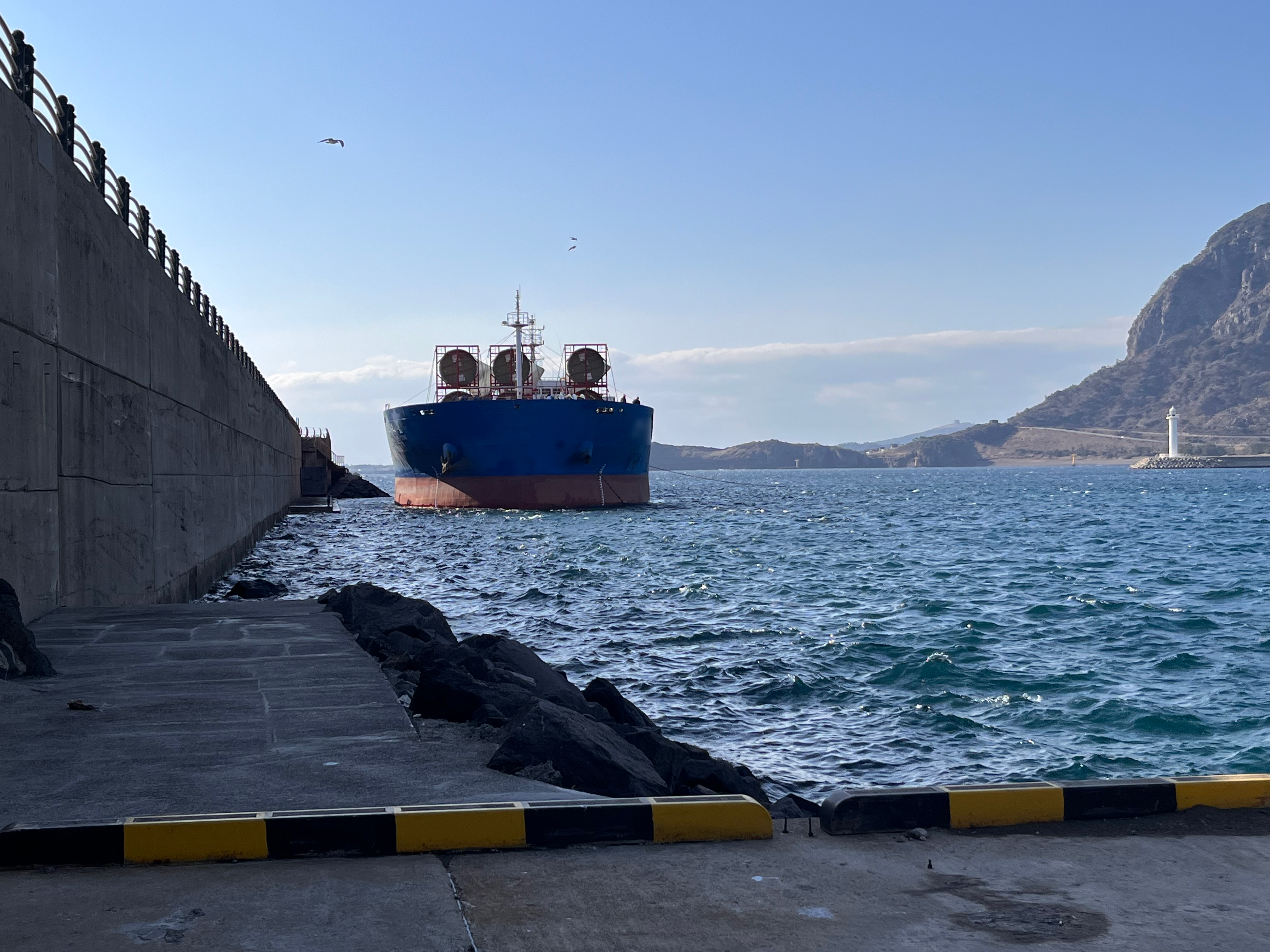 서귀포해양경찰서(서장 김진영)는 어제(27일) 오후 2시 40분쯤 화순항으로 입항 중이던 화물선 A호(5,126톤, 파나마 선적, 승선원 14명)가 접안 시도 중 엔진이 작동되지 않아 방파제 쪽으로 떠밀리고 있다는 신고를 접수받고 경비함정과 민간어선을 동원해 안전하게 구조했다고 밝혔다.