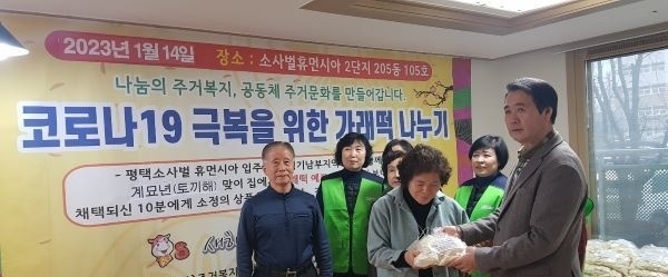 (사)주거복지연대 경기남부지사(지사장 이석훈)은 설 명절을 맞아 취약계층 및 소외계층과 함께 떡가래 나눔 행사를 지난 1월 14일 소사벌휴먼시아에서 개최했다.
