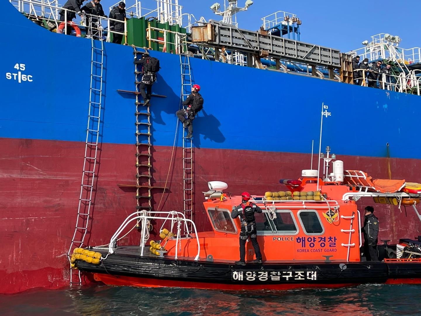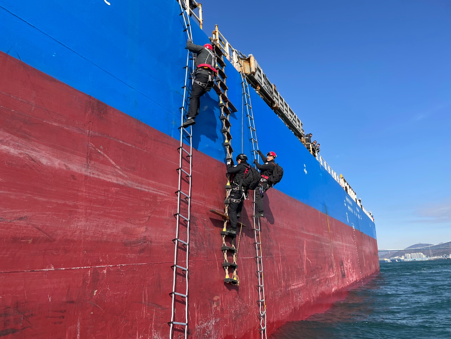 울산해양경찰서(서장 신주철)는 17일 오전 10시 울산항 인근 해상에서 대형선박 사고에 대비한 해경 구조대원의 인명구조 등선훈련을 실시했다고 밝혔다.