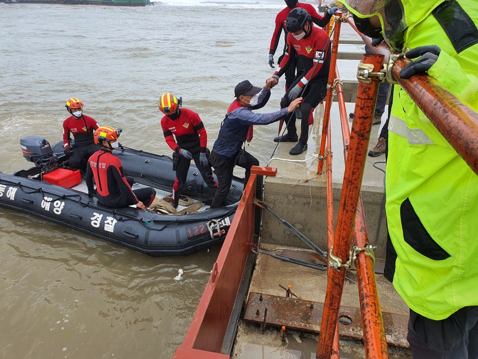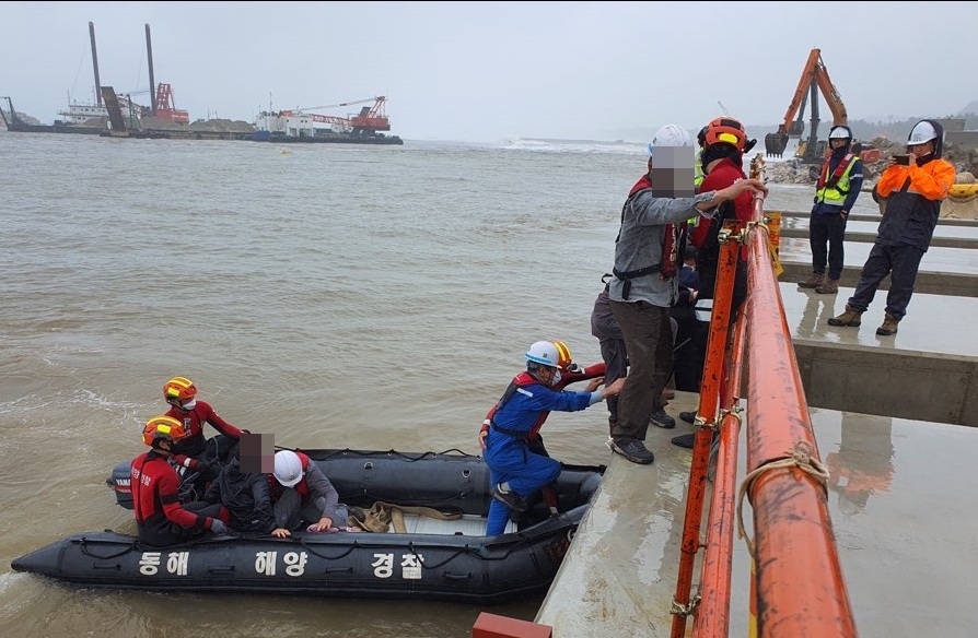 이에 동해해경은 삼척파출소와 동해해양특수구조대를 투입해 밧줄이 끊어져 선회중인 작업선의 표류, 좌초 등 2차 사고를 대비해 5척에 각각 승선해 있는 12명을 순차적으로 RIB보트를 이용해 육상으로 안전하게 이송조치 하였으며, 기상 호전 시 밧줄을 이용해 육상과 고정 작업을 진행할 예정이다.