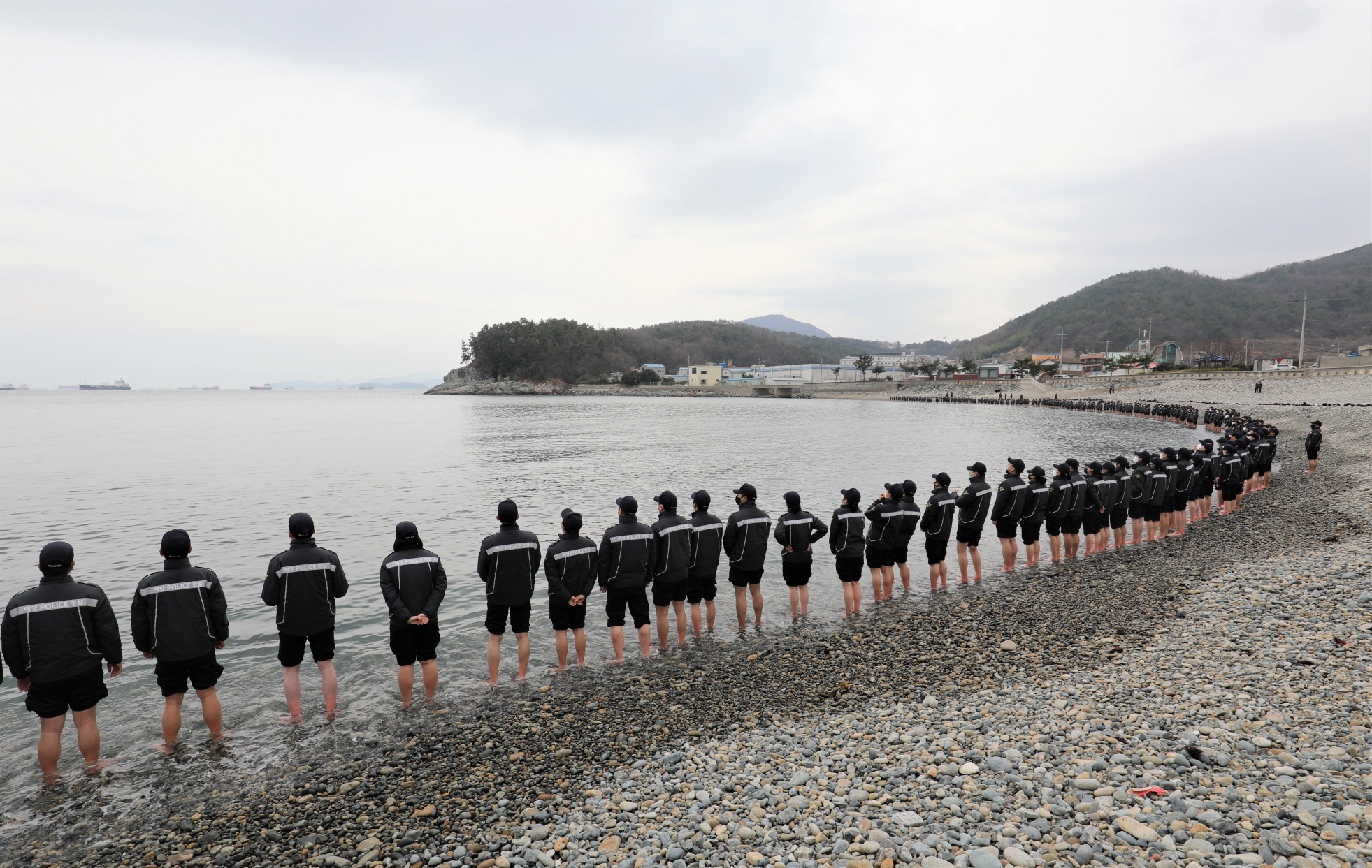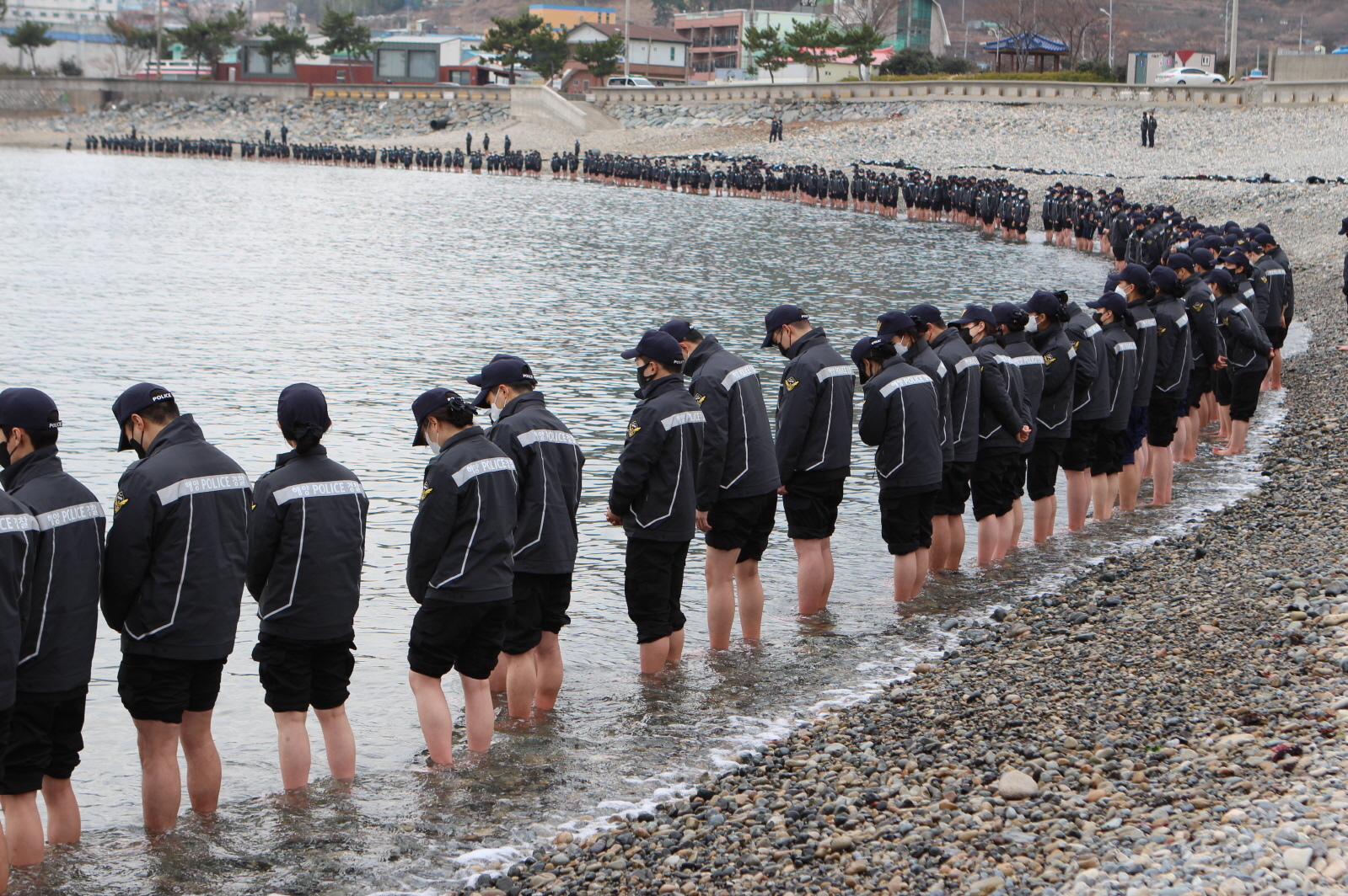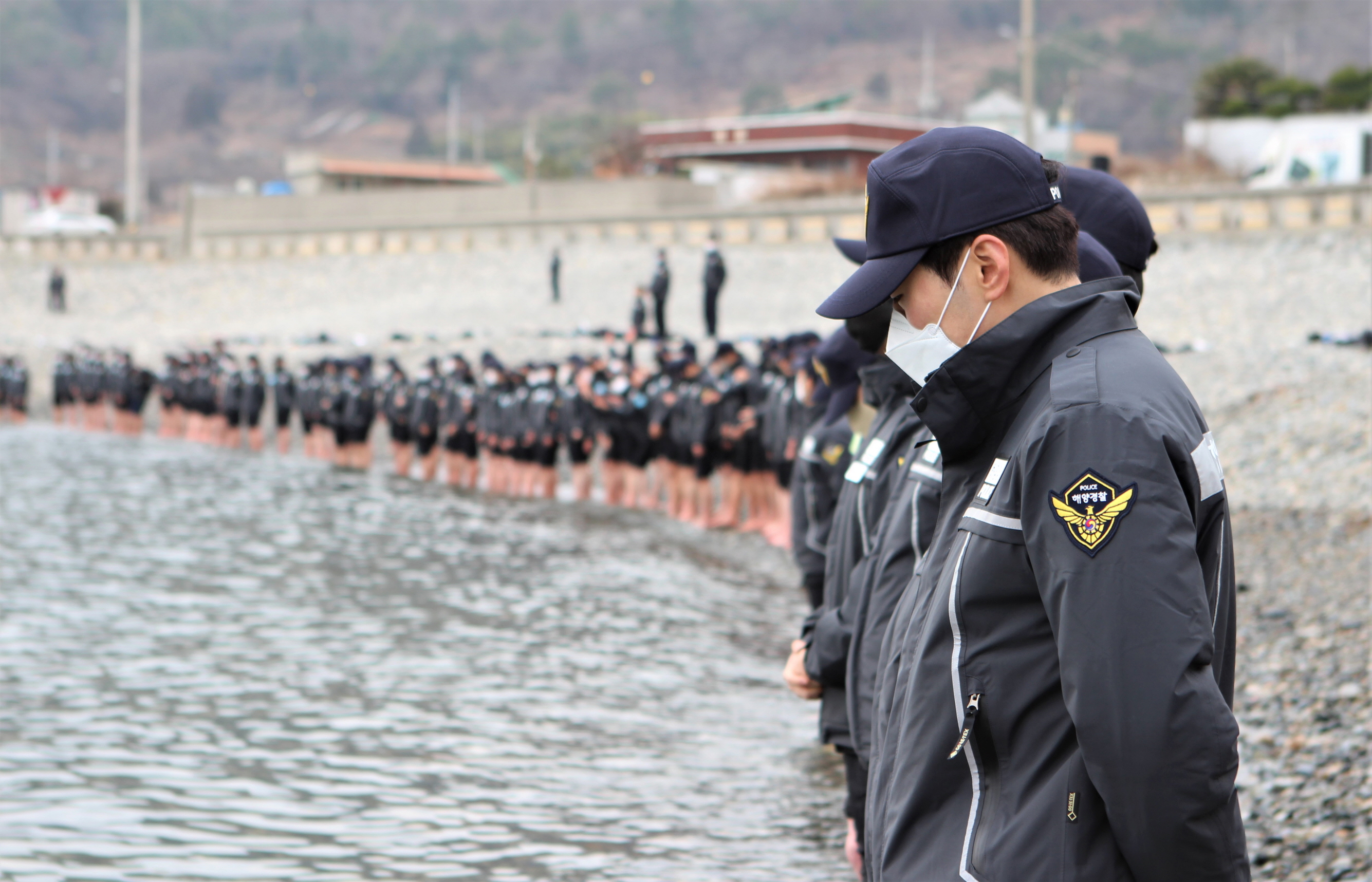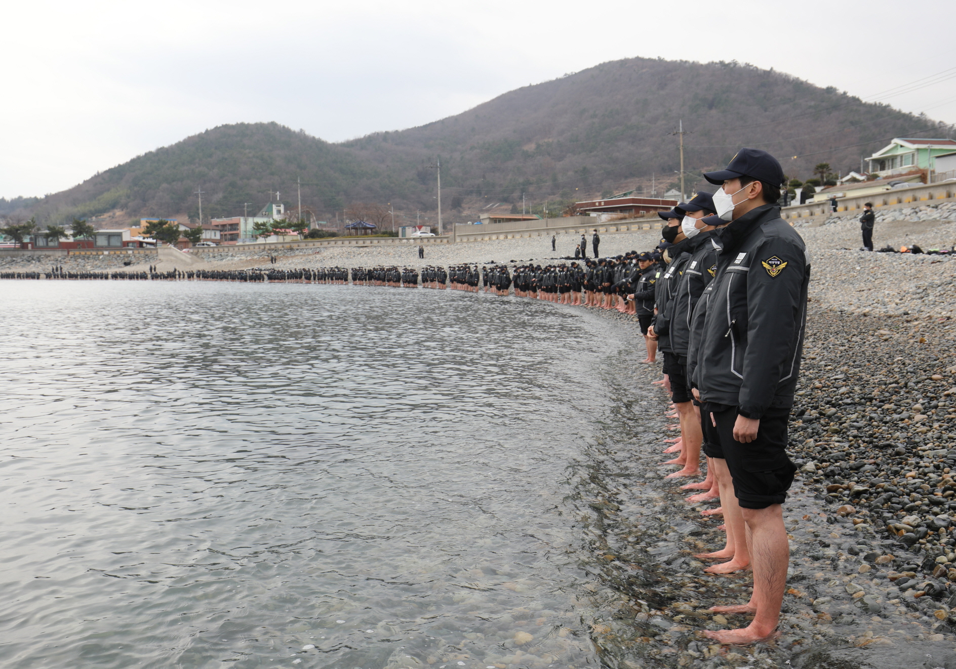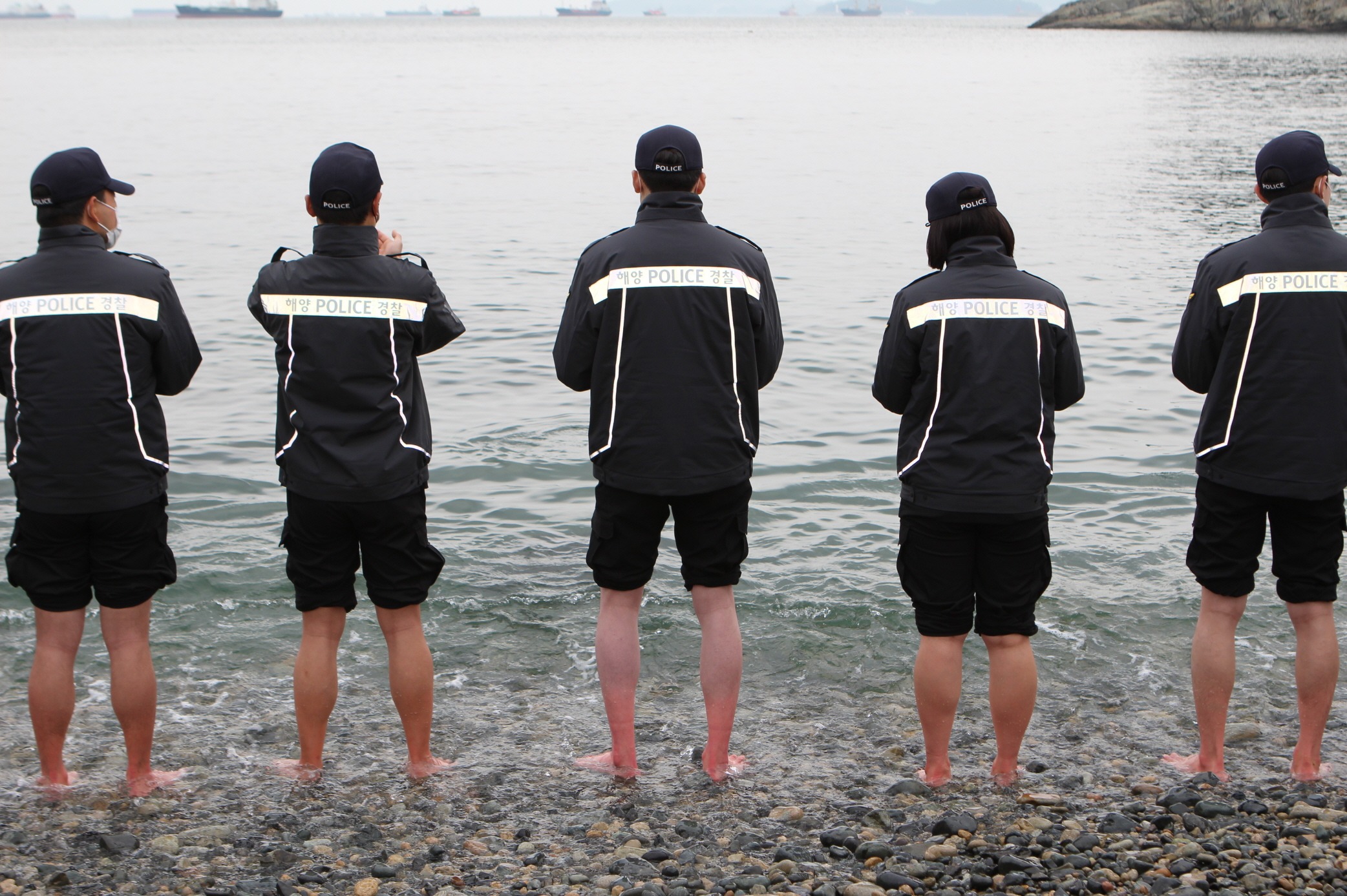 교육생들은 이날 바다에 발을 담근 채 ‶나는 반드시 멋진 해양경찰이 되겠습니다″ 라고 개인별 다짐을 외친 뒤 저 멀리 수평선을 바라보며 새로운 각오를 다졌다.