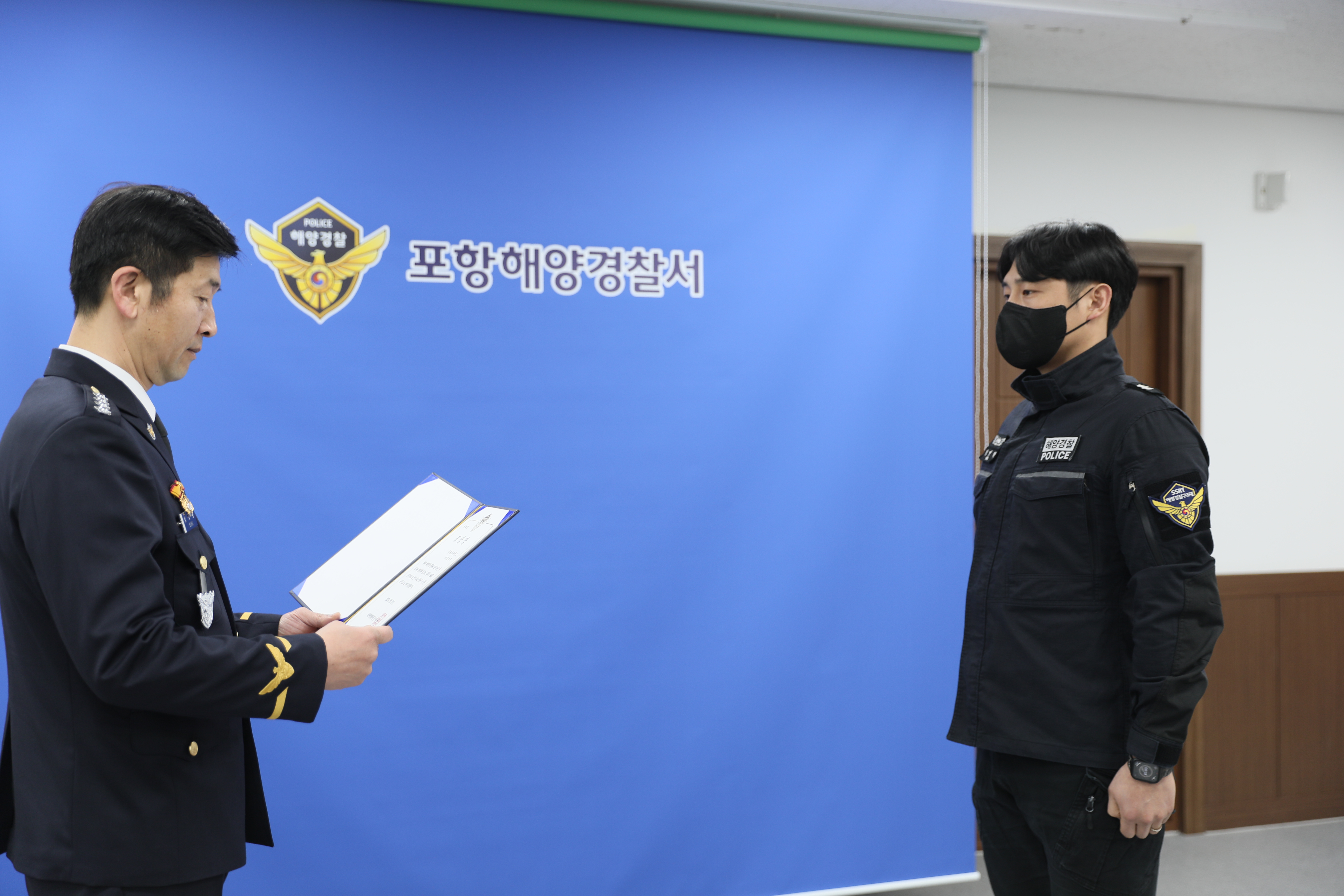 이에 오늘 2월 17일, 성대훈 서장은 구룡포파출소 김영혁 순경에게 어선 사고예방 및 안전관리 유공으로 포항해양경찰서장 표창을 수여했다.